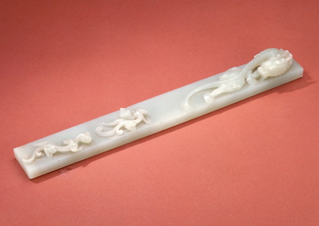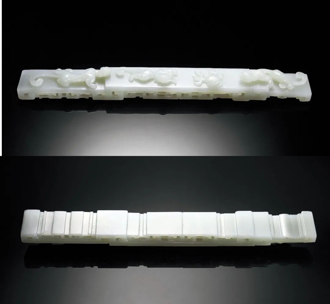 此件白玉镇尺周身无瑕,精工而不惜料,显出此期乾隆宫廷玉器的典型风格,其应为宫中文房陈设。与本品相类的玉雕镇尺,可参见北京故宫博物院藏 青玉浮雕龙螭长条镇纸,其亦为三螭纹样,但厚度不及本品,亦不若本品镂雕繁复,可资为一例参照。