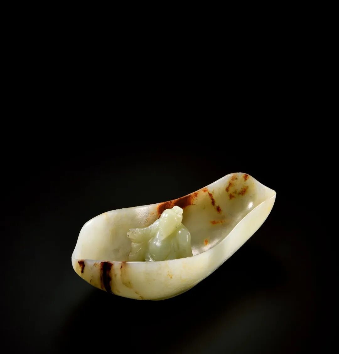 本品特别之处在于,雕刻了两船上众人劳作、休憩的形态,细节之生动几如《清明上河图》中的一景。工艺之巧,耗费工时、物料之巨,实仅乾隆宫廷玉作所能琢成与本品题材相近者,可参照故宫博物院藏和田青玉船一例,录于《中国玉器全集·6》第191页,图二七四。彼件亦为乾隆玉作之妙品,与本品同为双舟题材,但其船上有蓬,虽细节亦丰富,但人物、场景之刻画不若本品生动,且本品雕刻船锚、纤绳勾连纤巧,可谓将乾隆玉雕的精巧生动表现淋漓。