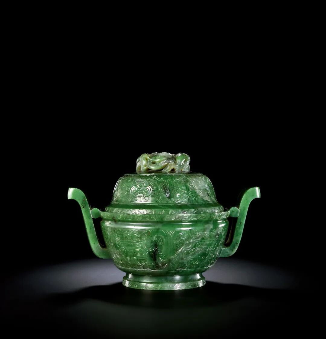 清代宫廷仿古玉器制造繁盛,尤自乾隆年始,因西疆平定,玉料供应充足,且受乾隆帝嗜古之好的影响,宫中此式碧玉雕成的仿古炉制作尤盛。此炉富有浓郁的清代宫廷气息,呈现出鲜明的时代风格。