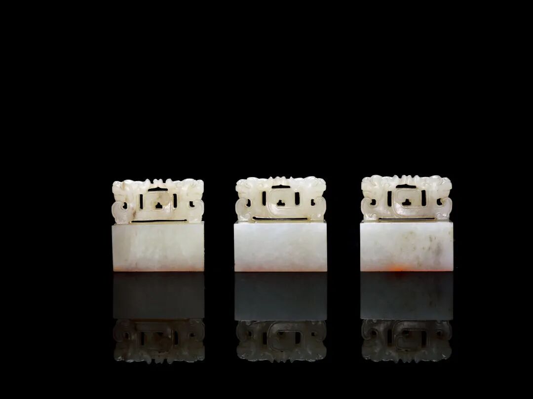 此组印章以青白玉为质,玉色温润剔透。三枚印章形作四方,线条转折利落,其上设交体螭龙钮,三枚螭龙钮造型一致,可知此三枚印章应为成组套章。章钮双螭龙造型写意,雕双螭龙共身双首,形貌苍古,身躯线条简洁,刻双阴线勾边。其纹样颇有商周青铜纹样之韵味,但线条、布局富于装饰性,显仿古玉器之风格。