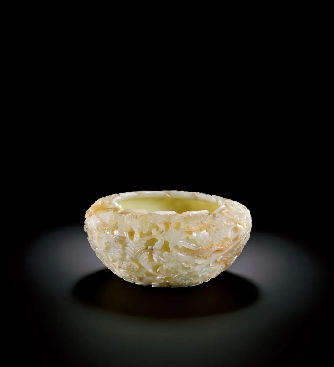 此件缠枝莲纹水洗,以整块白玉为材,色如凝脂,材质上佳。水洗圆肩敛腹,洗口为葵瓣造型,精致典雅,内部掏膛均匀规整,打磨细致。整器高浮雕缠枝莲纹,枝蔓层层缠绕,花瓣翻卷,舒展自如,繁缛而华丽,极具立体感。器底饰双层花卉纹,花瓣处饰阴刻线,丝缕分明。整器造型古朴典雅,雕工细腻精美,具有典型的乾隆宫廷仿痕都斯坦玉器特点,胎体轻薄,花纹细腻,是难得的文房雅器。