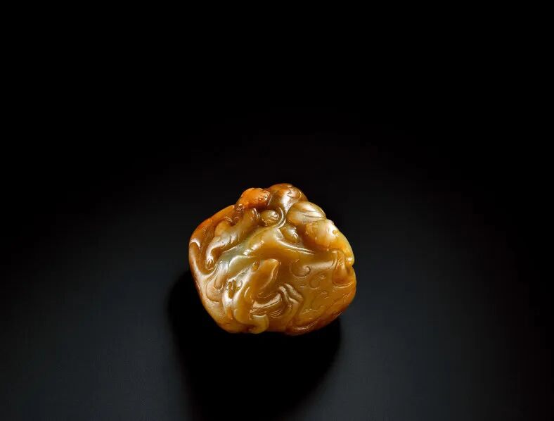此玉镇呈熟黄色,细润莹泽,整体布满黄色的沁色,古意十足。取“苍龙教子”题材,通体浮雕苍龙教子纹,螭龙部分身体隐于朵云之下,产生神龙教首不见尾的视觉效果,具有元代治玉特征。螭龙头呈倒梯形,鬃毛后披,身形粗壮,具有部分元代特征。整体雕工精湛,纹饰具有独特性,局部有红沁,是为少见的文房佳品。