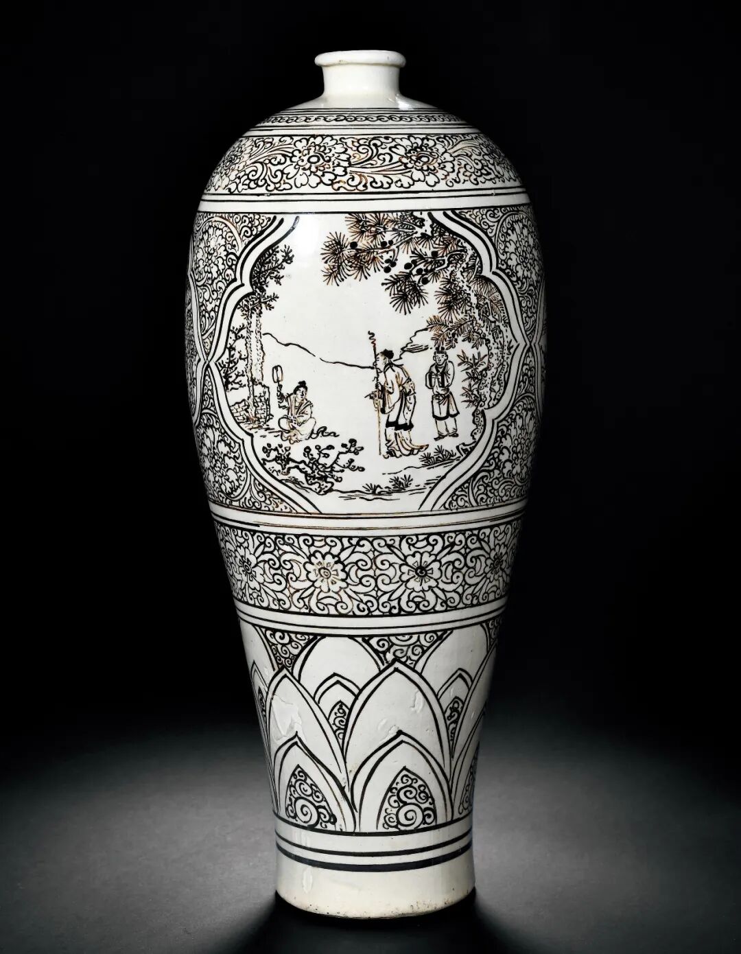 明 白地黑花菱花开光┌松风高隐图┘梅瓶