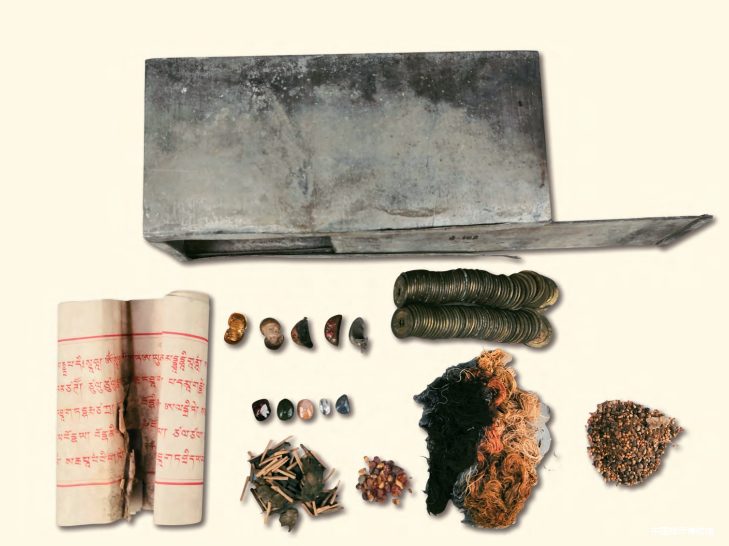 20世纪50年代,安定门城楼发现宝匣,此匣的制作及放置时间不详。从宝匣内钱币为“乾隆通宝”看, 推测宝匣放置于乾隆朝或更早,乾隆时期添加钱币等镇物。宝匣就是装有镇物的盒子,外观呈扁方形。从紫禁城发现的宝匣看,质地主要有铜、锡、木三种,有的外表面还镀金、彩绘或刻有图案;镇物种类也较丰富,多为五种金属的元宝、五种颜色的宝石、五色丝线或绸缎、五种谷物、五种药材、五种香料、五页经书及钱币等。