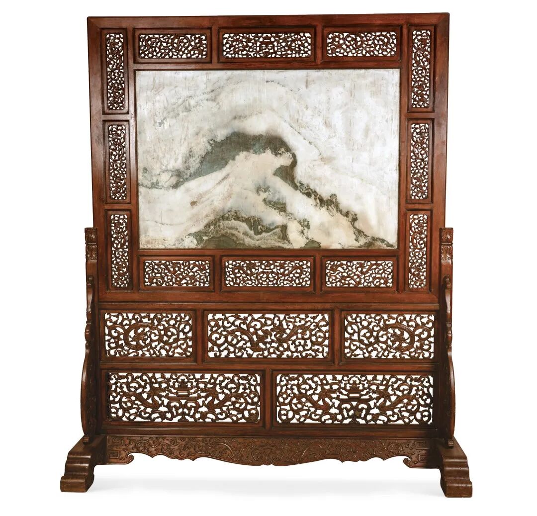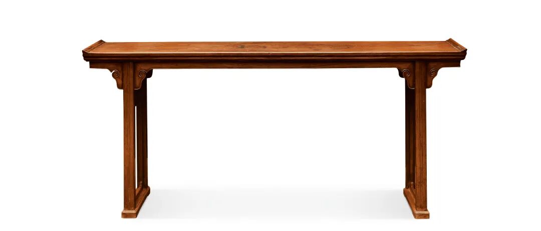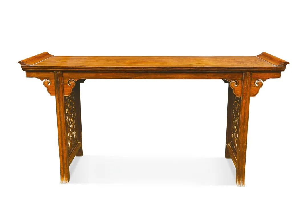 黄花梨为木中之黄金,木质细密坚韧,纹理如行云流水,色泽温润,木香清雅,然明末已近枯竭,甚为珍贵。明清时期,工匠们利用黄花梨独特的质量,自然纹理,制作家具,形成了独特的风格和审美趣味,使黄花梨家具成为家具中美的典范,更为宫廷珍视,指定为御用家具木材。此案黄花梨木质。案面攒框镶独板心,冰盘边沿,两端安装翘头。面下牙条与锼出的云纹牙头为一木连作,在牙条及云纹牙头边沿起阳线。牙条两端衔接牙堵成环匝。案腿上端打槽,夹着牙条、牙头与案面相交,此为夹头榫结构。前后腿间装透雕海水龙纹挡牌。整体造型简练,气势内敛,原皮壳,赭中泛红,甚温润,比例得宜,造型简练,为明式家具之经典制式。