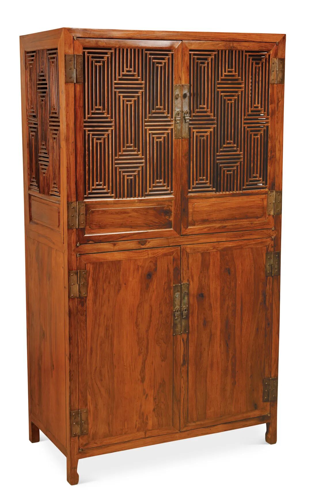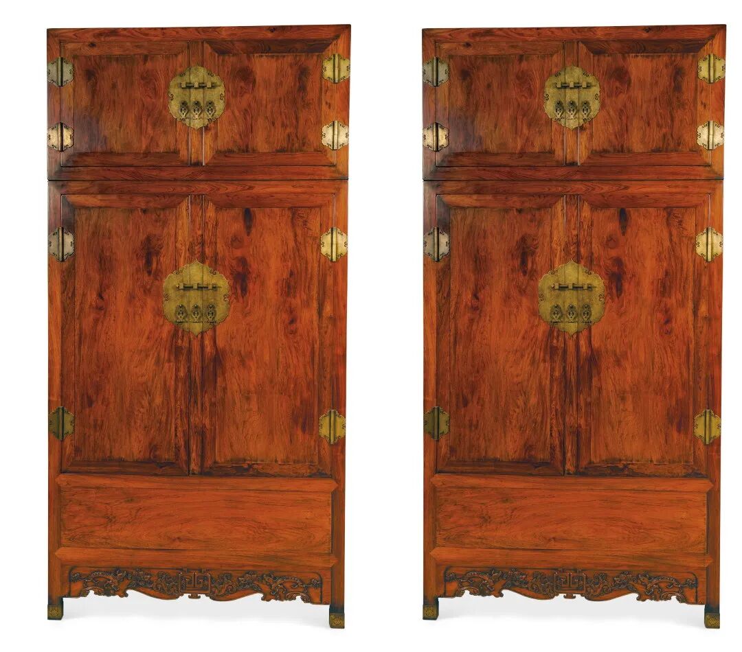 此明式万历柜通体以黄花梨为材,上部亮格有后背板,三面敞口,券口边沿起阳线,前栏铲地浮雕对首双龙纹。下层柜门对开门,外侧装有长方形合页。柜门及两侧柜帮攒边打槽装板。柜门中部装有条形铜面叶、钮头及镂空吊牌。两足间下部装有素牙板。整器用料考究,品相甚佳,是为数不多的明清之际亮格柜传世佳作。