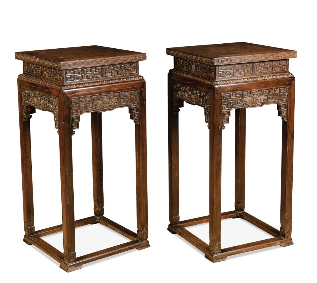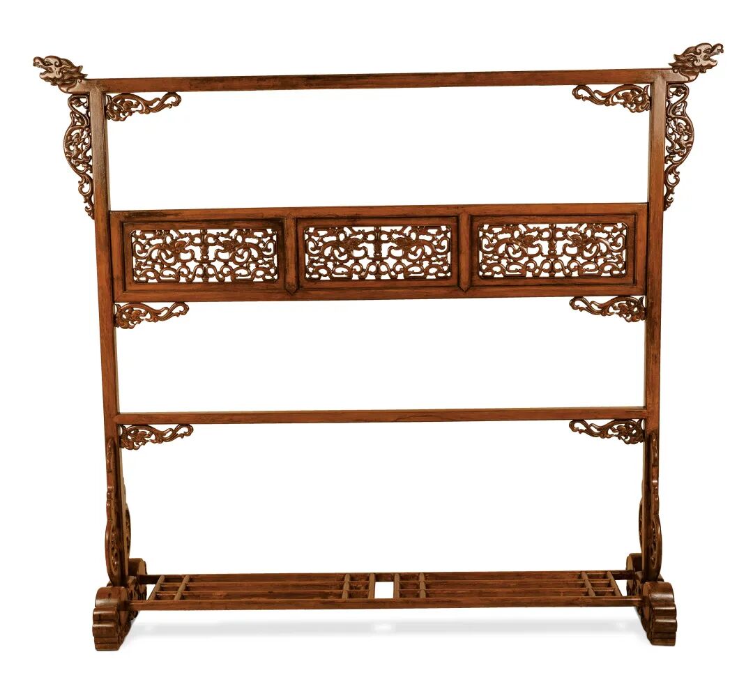 拍品床座为标准格角攒边,下有四根支承带二端出榫纳入大边。四框内缘踩边打眼造软屉,边抹立面打洼踩委角线至底端压一窄平线。束腰与直牙条格肩接合方材直腿足,牙子沿边踩委角线延续连接至腿足一气呵成。长牙条内有一枚穿销贯上床座大边用以加强稳固性。下座构件通体打洼。方材直腿足至底端内缩成方形矮足承。活动式的正面与侧面围子用短材攒接成卍字图案。此具黄花梨攒接围子罗汉床设计优美,精工细做。围子以攒接法将短材组成明代盛行的卍字纹图案。围子以及下座构件通体打洼,腿足至底端内缩成方形矮承足结束,非常特别,把罗汉床轻微的提升起来。独板围子罗汉床用料讲究,珍贵异常,而攒接围子罗汉床则以明代匠师的卓越工艺技法取胜。以攒接法将短材组成图案成围子,是传世明末清初罗汉床实例最为稀少的种类,不单只由于活动式的正面与侧面围子可装可拆,易与床座分离,攒接法造围子也比独板围子较难保存,所以特别罕见。
