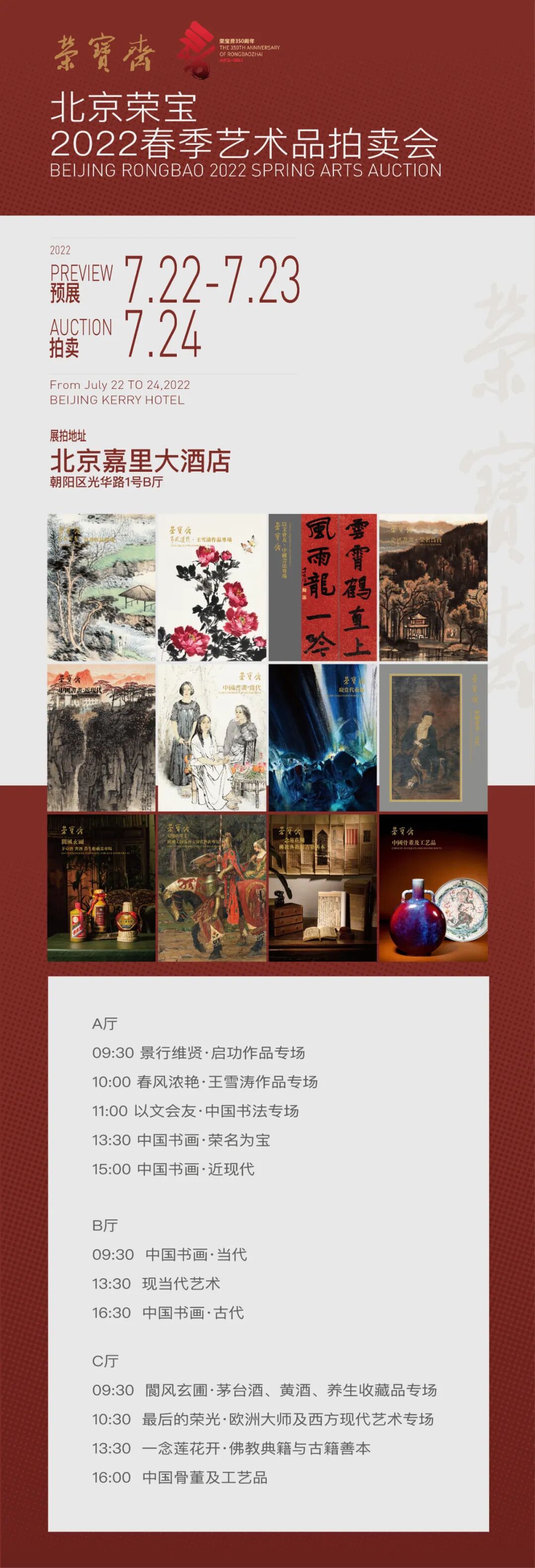 北京荣宝2022春季艺术品拍卖会定档于7月22日在北京嘉里大酒店拉开序幕。时值荣宝斋350周年,我们凭籍深厚广博的藏家资源,精益求精的专业精神,努力为藏家寻觅与挖掘艺术精品。近现代书画版块是拍卖市场的重中之重,一直受市场和藏家高度关注。此次近现代书画专场推出300多件书画精品,名家纷呈、蔚为大观。