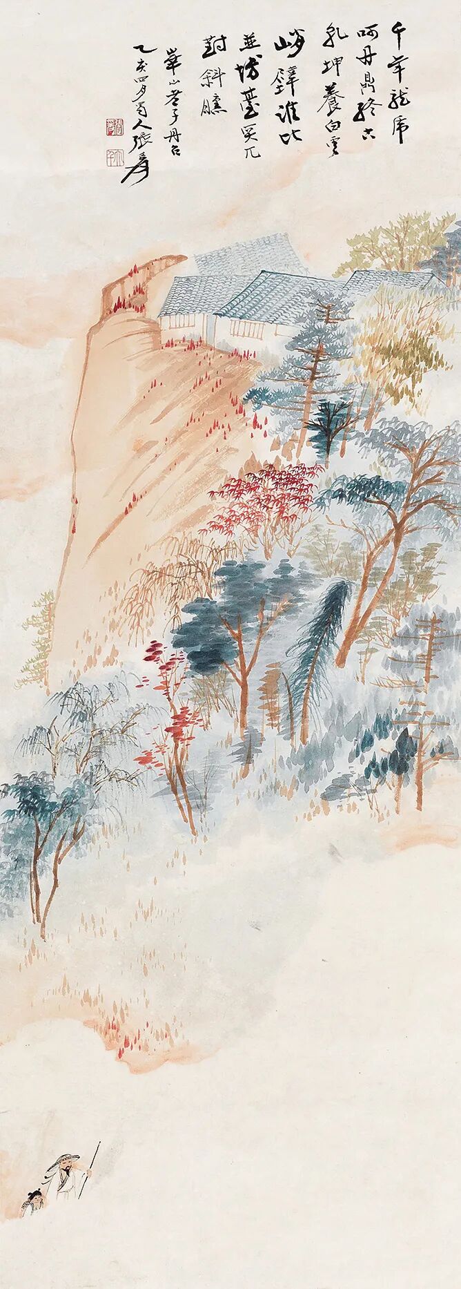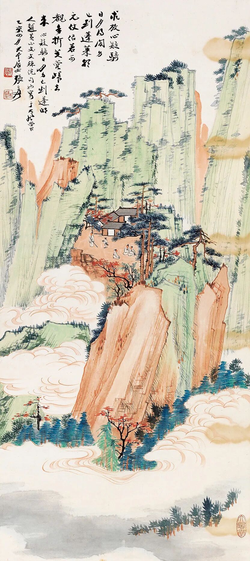 款识:求放心疑骑日月,得闲身已到蓬莱。朝元杖侣若可睹,手折芙蓉归去来。心疑骑日月,身已到蓬莱。明人题黄山文殊院句也。写于大风堂下,乙亥四月,大千居士张爰。