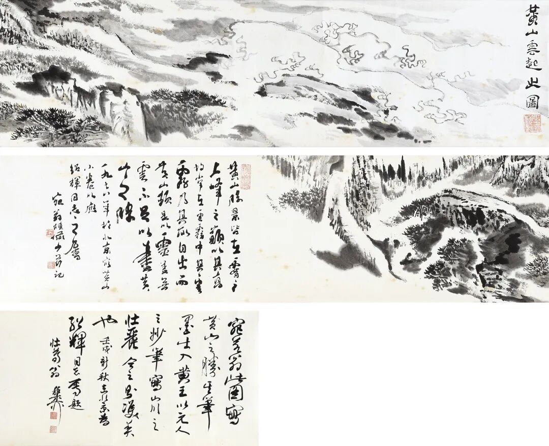 款识:黄山云起之图。黄山胜景,皆在腰之上,峰之巅。以其高,故常在云雾中。其云雾乃其所自出,而黄山显是以灵。盖无云不足以尽黄山之胜。一九七八年于北京写黄山小卷,以应绍辉同志之属。宛翁陆俨少并记。