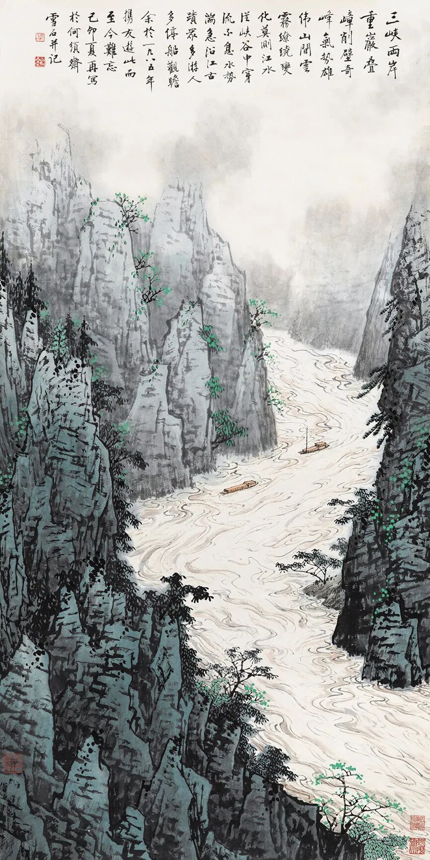 款识:三峡两岸重岩叠嶂,削壁奇峰气势雄伟,山间云雾缭绕,变化莫测,江水从峡谷中穿流不息,水势湍急,沿江古迹众多,游人多停船观瞻。余于一九八五年携友游此,而至今难忘,己卯夏再写于何须斋,雪石并记。