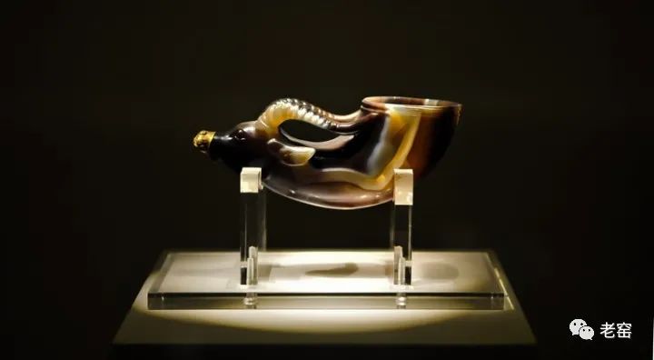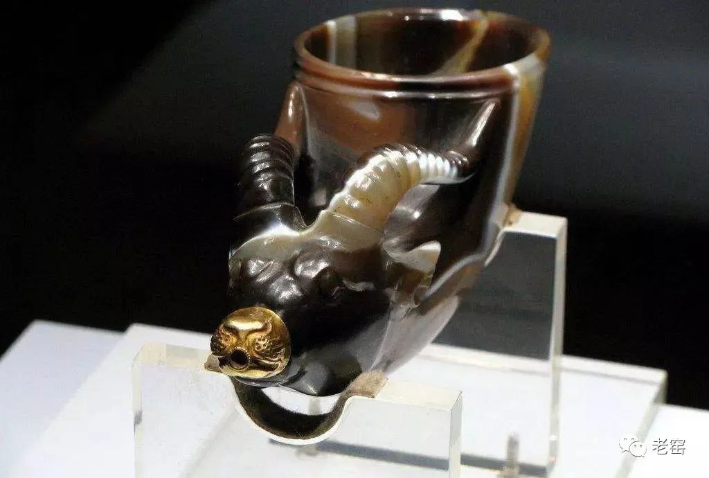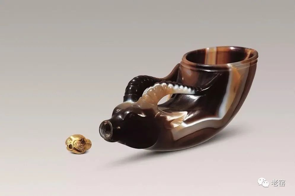 镶金兽首玛瑙杯,唐代酒器,现收藏于陕西历史博物馆。1970年在西安市南郊何家村出土,是至今所见的唐代唯一一件俏色玉雕,是唐代玉器做工最精湛的一件,此杯选用极为罕见的红色玛瑙琢制,杯体为角状兽首形,兽双角为杯柄,嘴部镶金帽,眼、耳、鼻皆刻划细微精确。
