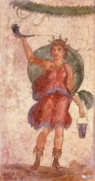 ▲古罗马庞贝遗址壁画 酒神 手持来通