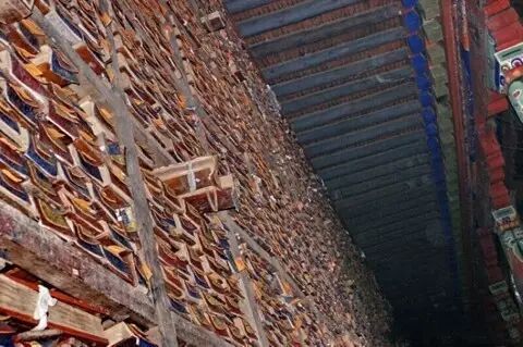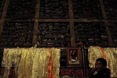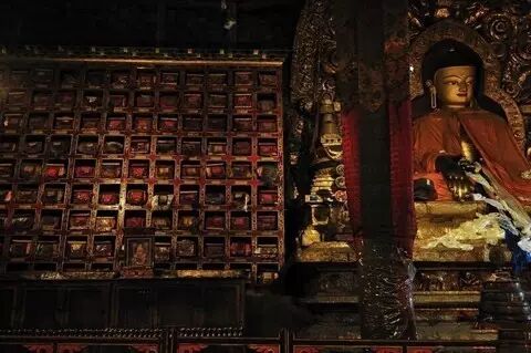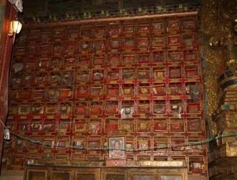 哈着腰穿越主殿中一个小小的通道,等我们直起身来时,已惊讶得不能言语:神佛们的背后隐藏着一个神秘的所在,有如幽深的时光隧道,壁立而起的,是一面硕大的经墙!这面墙全由一格一格的经书堆砌而成,粗粗测量一下,高约9米,宽约60多米!仿佛万里长城的一截飞身来此,掩埋下无数的智慧与情感。
