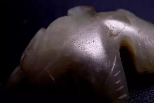 玉器表面的微痕有哪些特点?一是纵横交错:它区别于打磨痕迹,不应是一个方向或成组的,没有规律性;二是层层叠加:清代划一道,民国又划一道,文革再划一道,改革开放后还划一道,叠加在一起,不是在一个层面上的;三是分布不均:一般来讲,容易磨到的地方微痕重,不容易磨到的地方就显轻,甚至没有;四是和玉器的老化、风化作用于一起:有一种熟、莹润的感觉,越看越自然,越看越舒服。