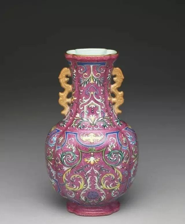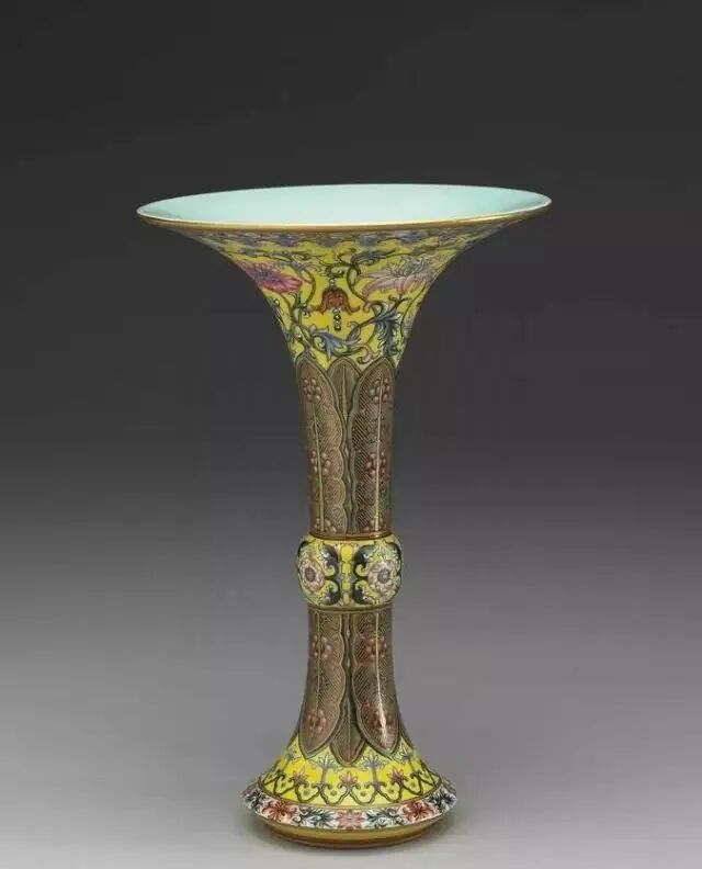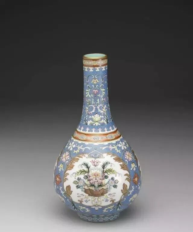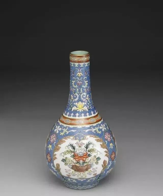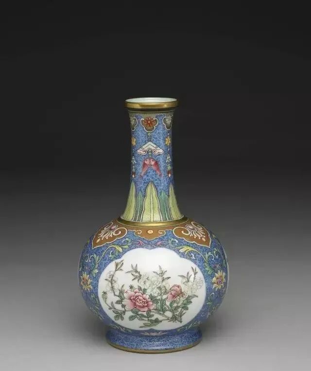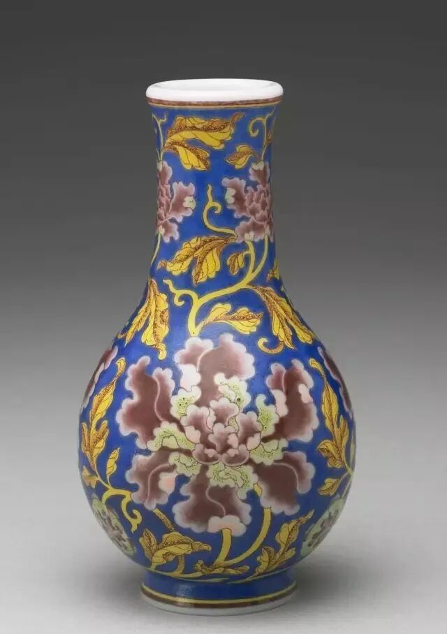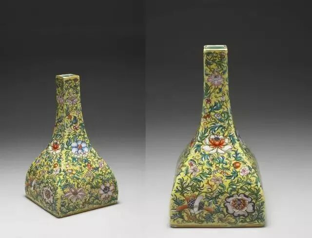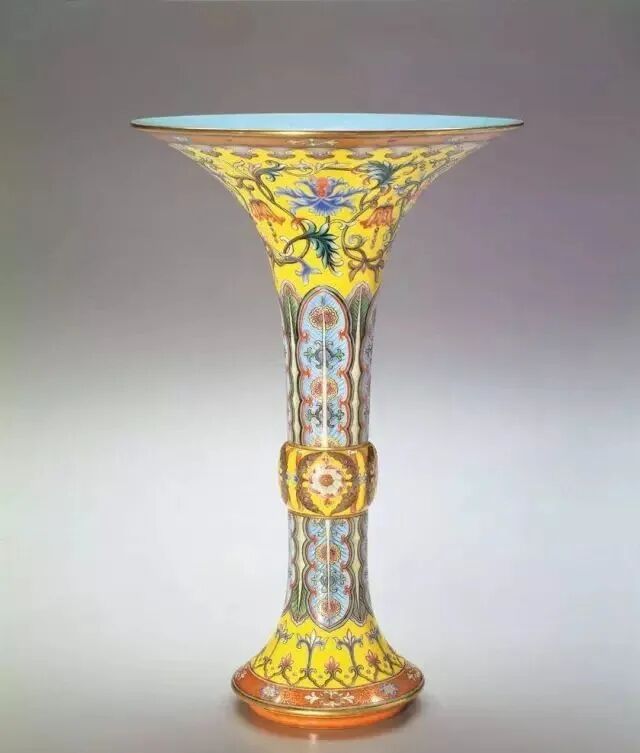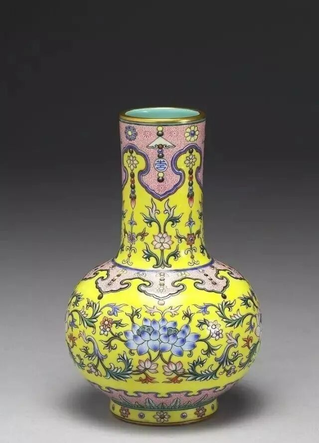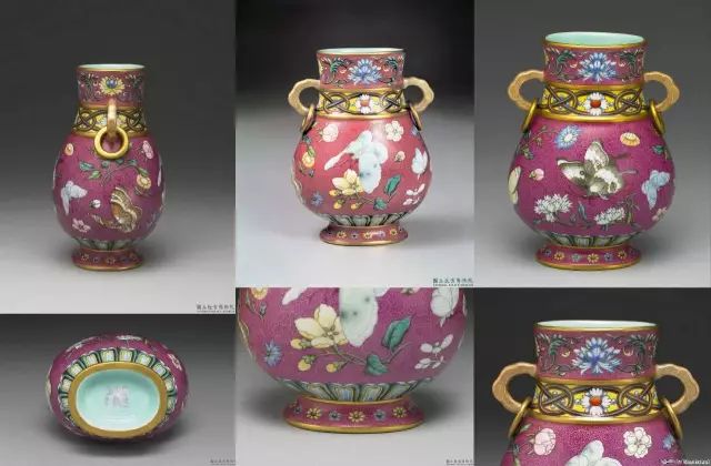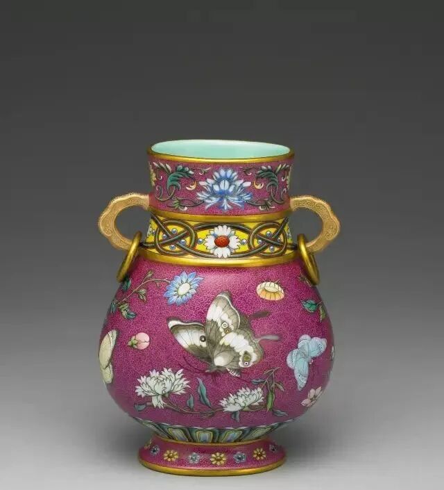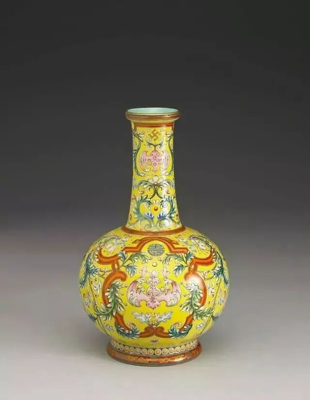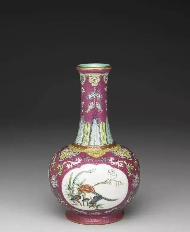 这些珐琅彩瓷器都是专作帝王赏玩,也有用作宗教、祭祀的供器之用。珐琅彩瓷器烧制极难,其在雍正年间烧制数量较多,后期逐渐减少,到清后期停滞。所以珐琅彩瓷器显得比较珍贵,特别是康雍时期主要用于帝王赏玩,如果下赐重臣或外交互赠时一般都有记录存档。清乾隆 珐琅彩紫地富贵瓶,高21厘米,口径3.4厘米,底4.5厘米,台北故宫博物院藏珐琅彩瓷从创烧到衰落全部由皇家垄断不外传,只局限于宫廷之中供皇室使用,属宫廷御用瓷器。因而在历代瓷器中,珐琅彩瓷器造价最贵,艺术水平也最高,被誉为“官窑中的官窑”。清朝末年皇家因都无法承担它的巨额制作费用而停烧,导致工艺绝迹数百年,被誉为“世界上最奢侈的艺术品”。珐琅彩彩色繁多,多到十多种不同的色,彩料绘制的花纹是堆起来的一层厚厚的料,有立体感,用手指可摸得到,非常艳丽美观。清乾隆 黄釉粉彩八卦如意转心套瓶,台北故宫博物院藏目前,清代康雍乾三朝的传世珐琅彩瓷器绝大多都藏在台北故宫博物院收藏。下面,我们一起来鉴赏: