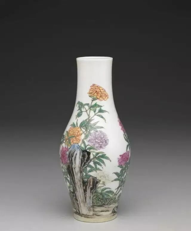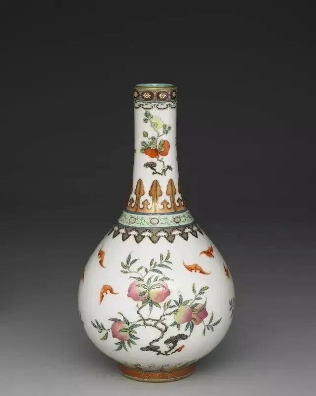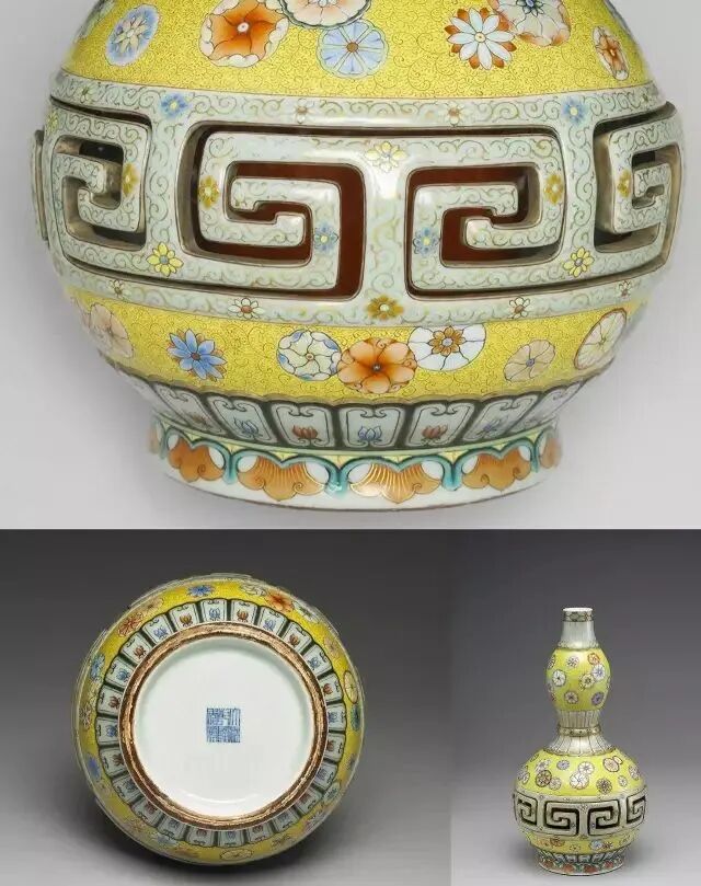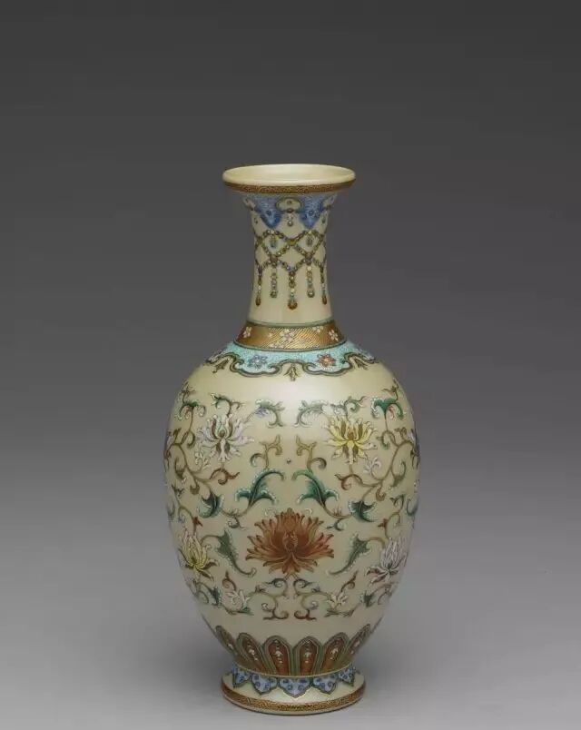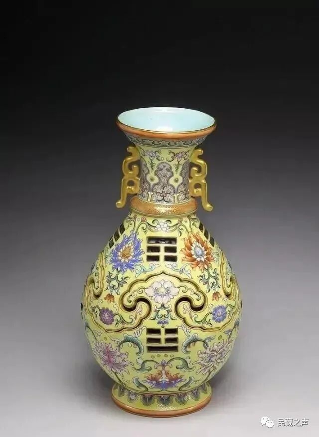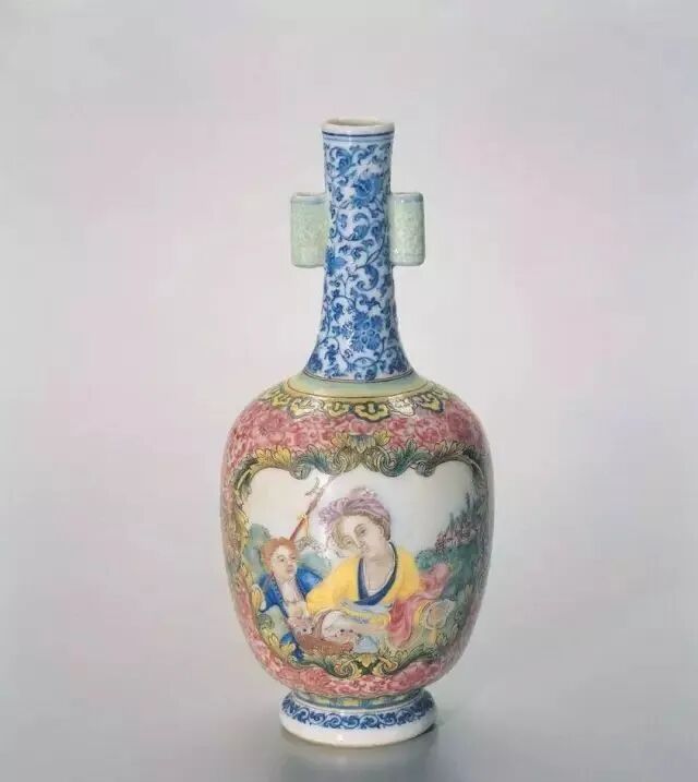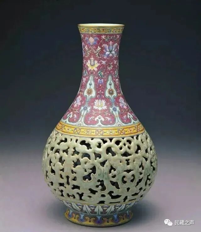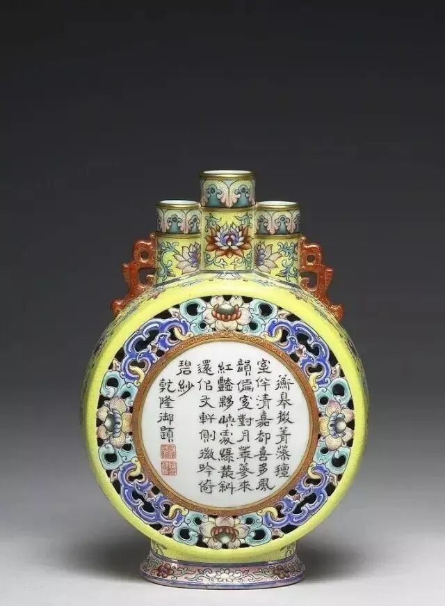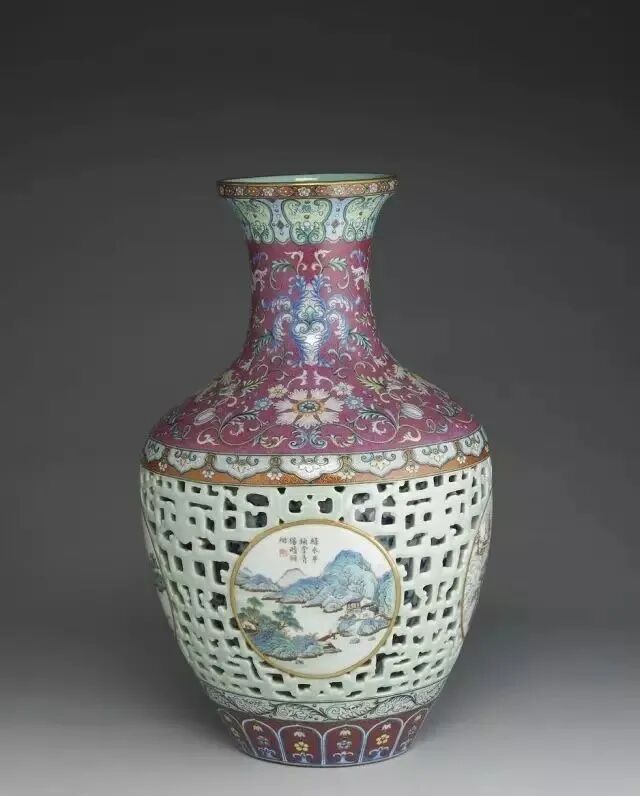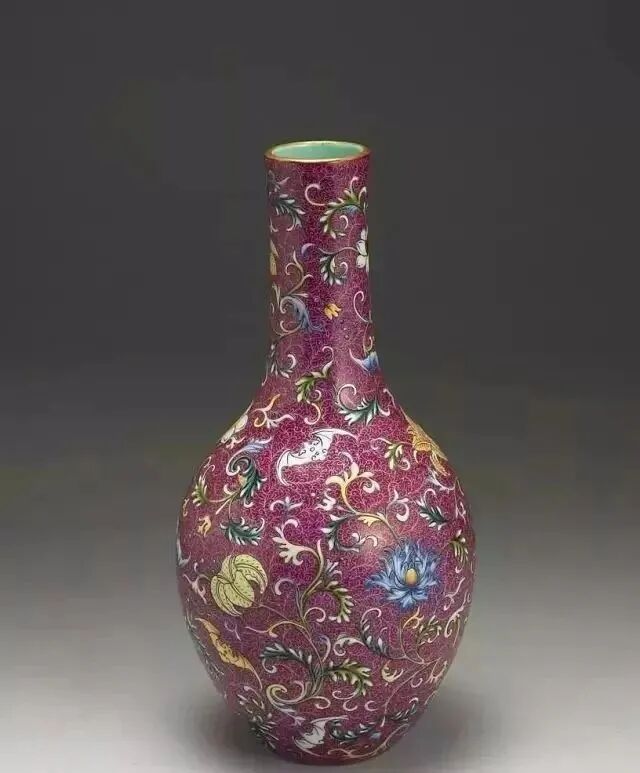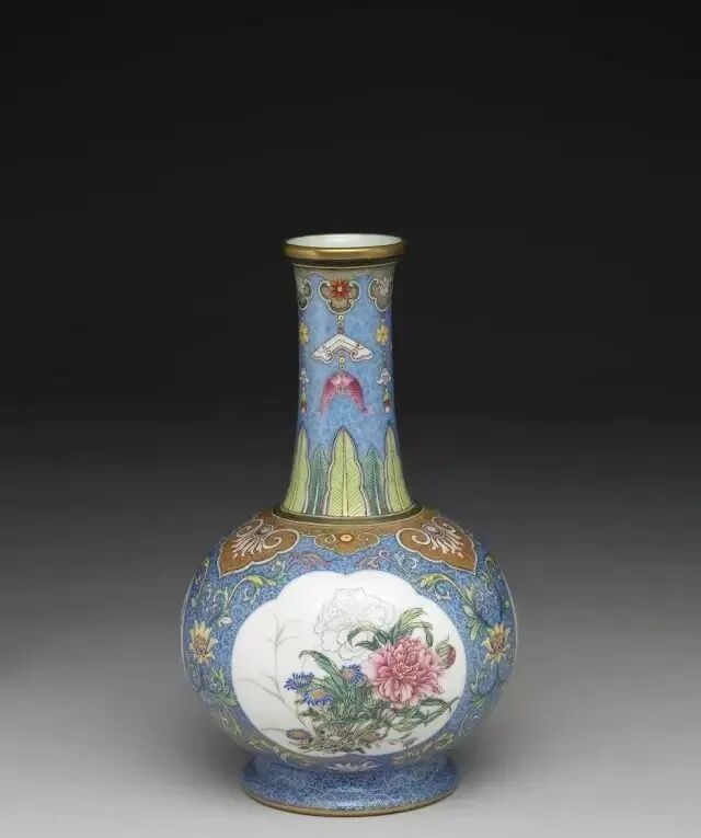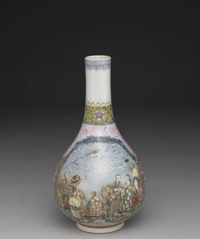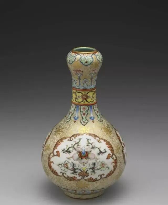 这些珐琅彩瓷器都是专作帝王赏玩,也有用作宗教、祭祀的供器之用。珐琅彩瓷器烧制极难,其在雍正年间烧制数量较多,后期逐渐减少,到清后期停滞。所以珐琅彩瓷器显得比较珍贵,特别是康雍时期主要用于帝王赏玩,如果下赐重臣或外交互赠时一般都有记录存档。清乾隆 珐琅彩紫地富贵瓶,高21厘米,口径3.4厘米,底4.5厘米,台北故宫博物院藏珐琅彩瓷从创烧到衰落全部由皇家垄断不外传,只局限于宫廷之中供皇室使用,属宫廷御用瓷器。因而在历代瓷器中,珐琅彩瓷器造价最贵,艺术水平也最高,被誉为“官窑中的官窑”。清朝末年皇家因都无法承担它的巨额制作费用而停烧,导致工艺绝迹数百年,被誉为“世界上最奢侈的艺术品”。珐琅彩彩色繁多,多到十多种不同的色,彩料绘制的花纹是堆起来的一层厚厚的料,有立体感,用手指可摸得到,非常艳丽美观。清乾隆 黄釉粉彩八卦如意转心套瓶,台北故宫博物院藏目前,清代康雍乾三朝的传世珐琅彩瓷器绝大多都藏在台北故宫博物院收藏。下面,我们一起来鉴赏: