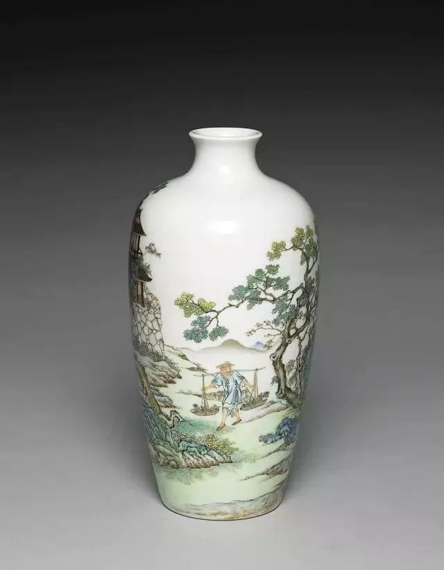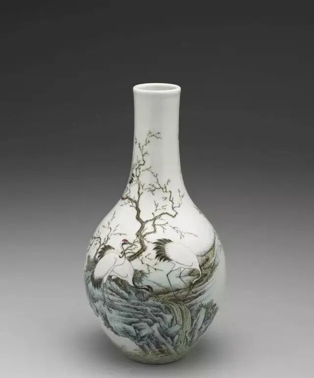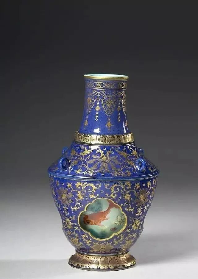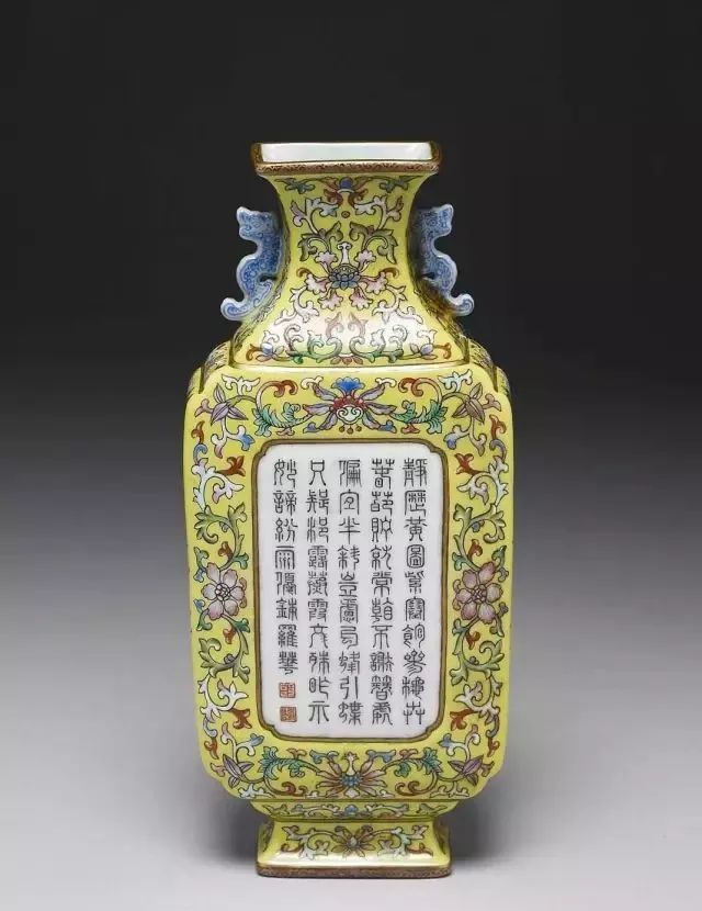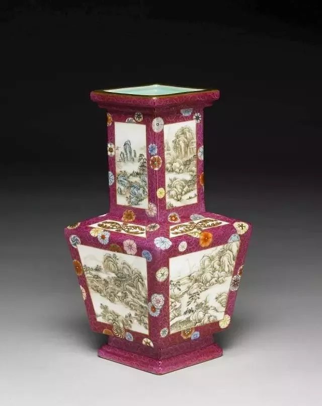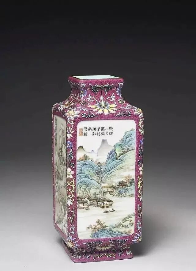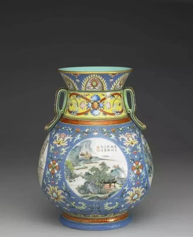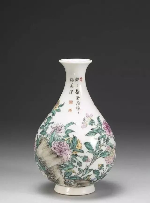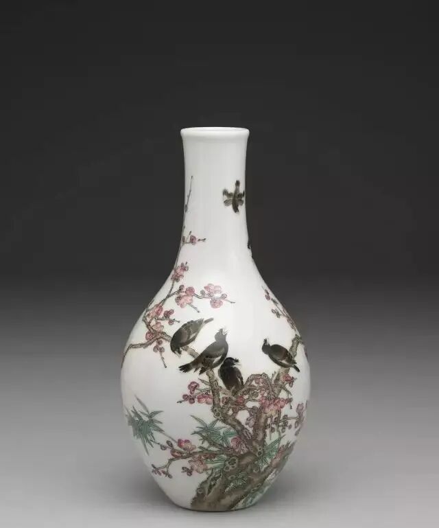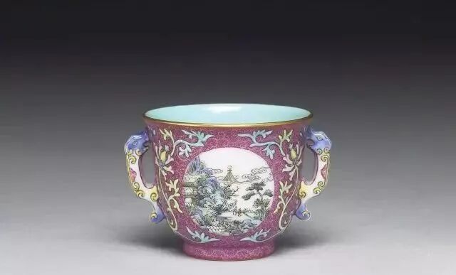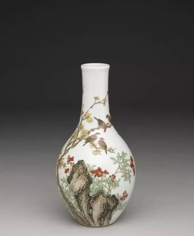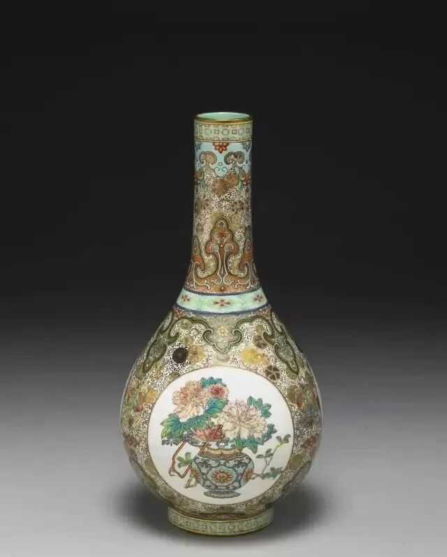 这些珐琅彩瓷器都是专作帝王赏玩,也有用作宗教、祭祀的供器之用。珐琅彩瓷器烧制极难,其在雍正年间烧制数量较多,后期逐渐减少,到清后期停滞。所以珐琅彩瓷器显得比较珍贵,特别是康雍时期主要用于帝王赏玩,如果下赐重臣或外交互赠时一般都有记录存档。清乾隆 珐琅彩紫地富贵瓶,高21厘米,口径3.4厘米,底4.5厘米,台北故宫博物院藏珐琅彩瓷从创烧到衰落全部由皇家垄断不外传,只局限于宫廷之中供皇室使用,属宫廷御用瓷器。因而在历代瓷器中,珐琅彩瓷器造价最贵,艺术水平也最高,被誉为“官窑中的官窑”。清朝末年皇家因都无法承担它的巨额制作费用而停烧,导致工艺绝迹数百年,被誉为“世界上最奢侈的艺术品”。珐琅彩彩色繁多,多到十多种不同的色,彩料绘制的花纹是堆起来的一层厚厚的料,有立体感,用手指可摸得到,非常艳丽美观。清乾隆 黄釉粉彩八卦如意转心套瓶,台北故宫博物院藏目前,清代康雍乾三朝的传世珐琅彩瓷器绝大多都藏在台北故宫博物院收藏。下面,我们一起来鉴赏: