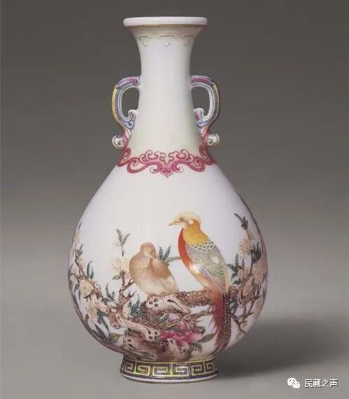 清乾隆珐琅彩“古月轩”题诗花石锦鸡图双耳瓶,以HKD115,480,000成交,2005-10-23香港苏富比秋季拍卖会。