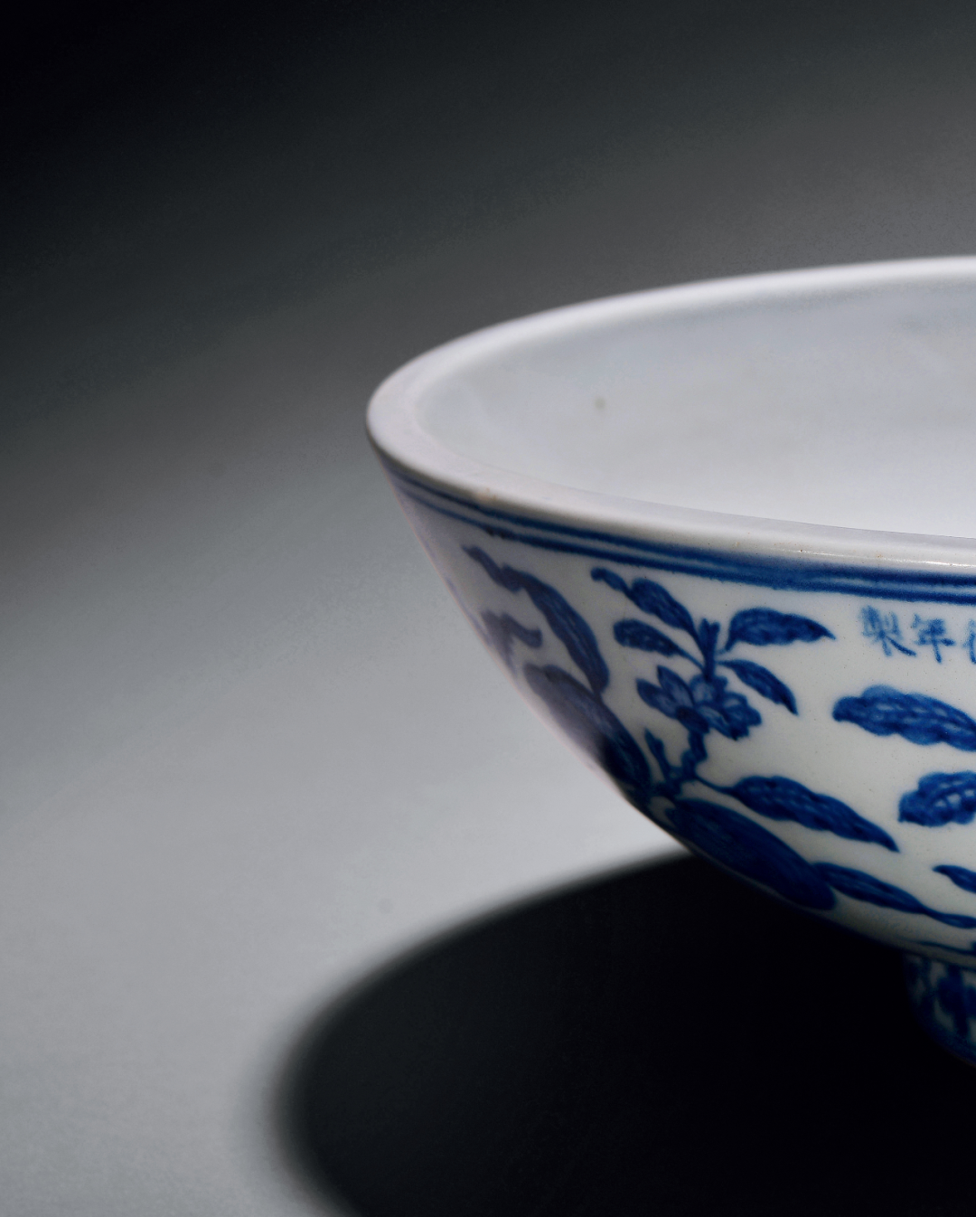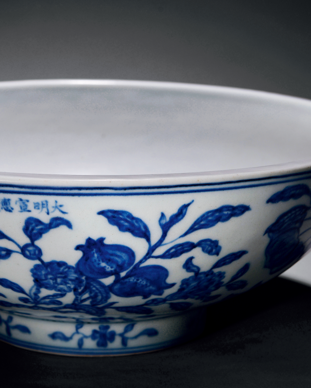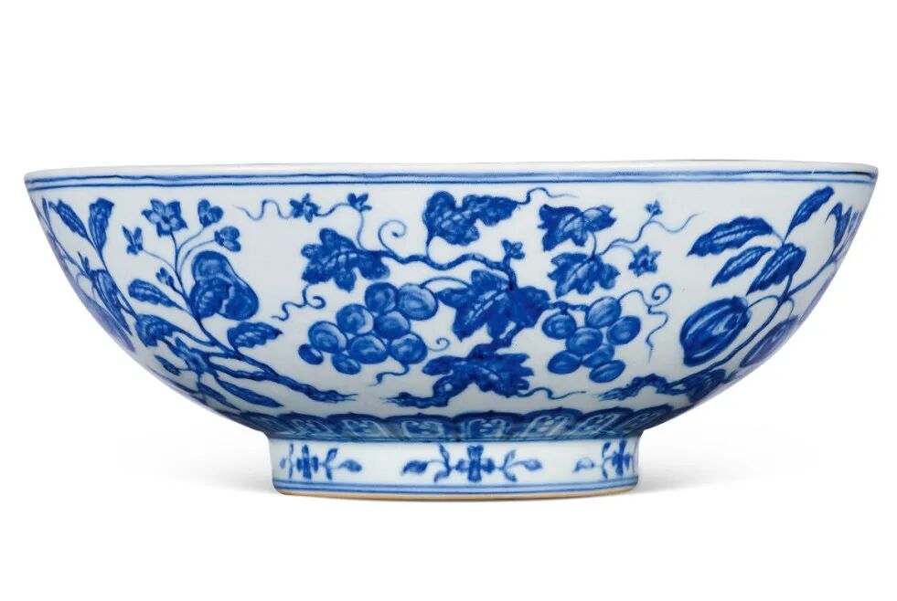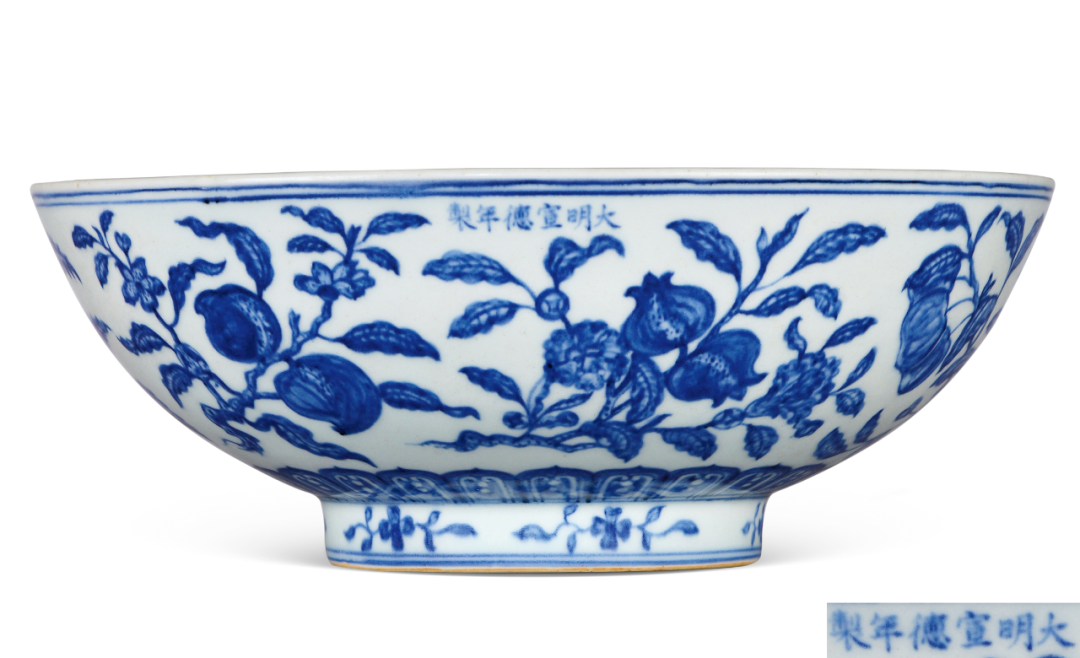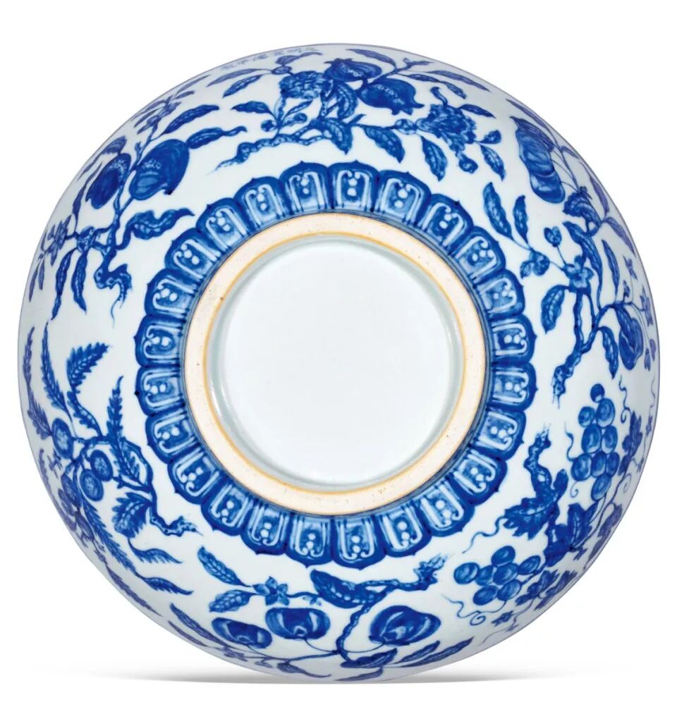 3.Messrs John Sparks旧藏,伦敦7.Cunliffe勋爵(1899-1963年)旧藏(标签PM89)8.Bluett & Sons旧藏,伦敦,1971年6月14日10. Doye,纽约,2003年9月16日,编号911.Daisy Lion-Goldschmidt,《Ming Porcelain》,伦敦,1978年,图542. 康蕊君,《玫茵堂中国陶瓷》,伦敦,1994-2010年,卷4,编号16553."A Dealer’s hand: the Chinese Art World through the eyes of Giuseppe Eskenazi",2012年,pl.3584.保利艺术研究院,《保利拍卖十五周年精品集·古董珍玩卷(上)》,2020年,编号1061."Chinese Bule and White Porcelain: 14th to 19th Centuries",东方陶瓷学会,The Arts Council Gallery,伦敦,1953-4,编号793.景德镇御窑博物院、保利艺术博物馆,“青花的故事——景德镇御窑遗址所出与海内外珍藏元明青花瓷器对比展”,北京,2022年6月20日-7月9日"估价:RMB 10,000,000-15,000,000本品器内素面无纹,器外纹样以青花为饰,圈足侧墙以梅花装饰,疏朗别致。胎体厚重,釉质细腻,内施白釉,外壁通体青花装饰,口沿绘青花弦纹两道,腹部绘六组折枝花果纹,石榴、寿桃、荔枝、柿子、枇杷、葡萄等,寓“多子多寿”之美意。近足处绘莲瓣纹一周,圈足处绘花朵纹。外口沿下青花横书“大明宣德年制”六字楷书款,为此式大碗统一的装饰。