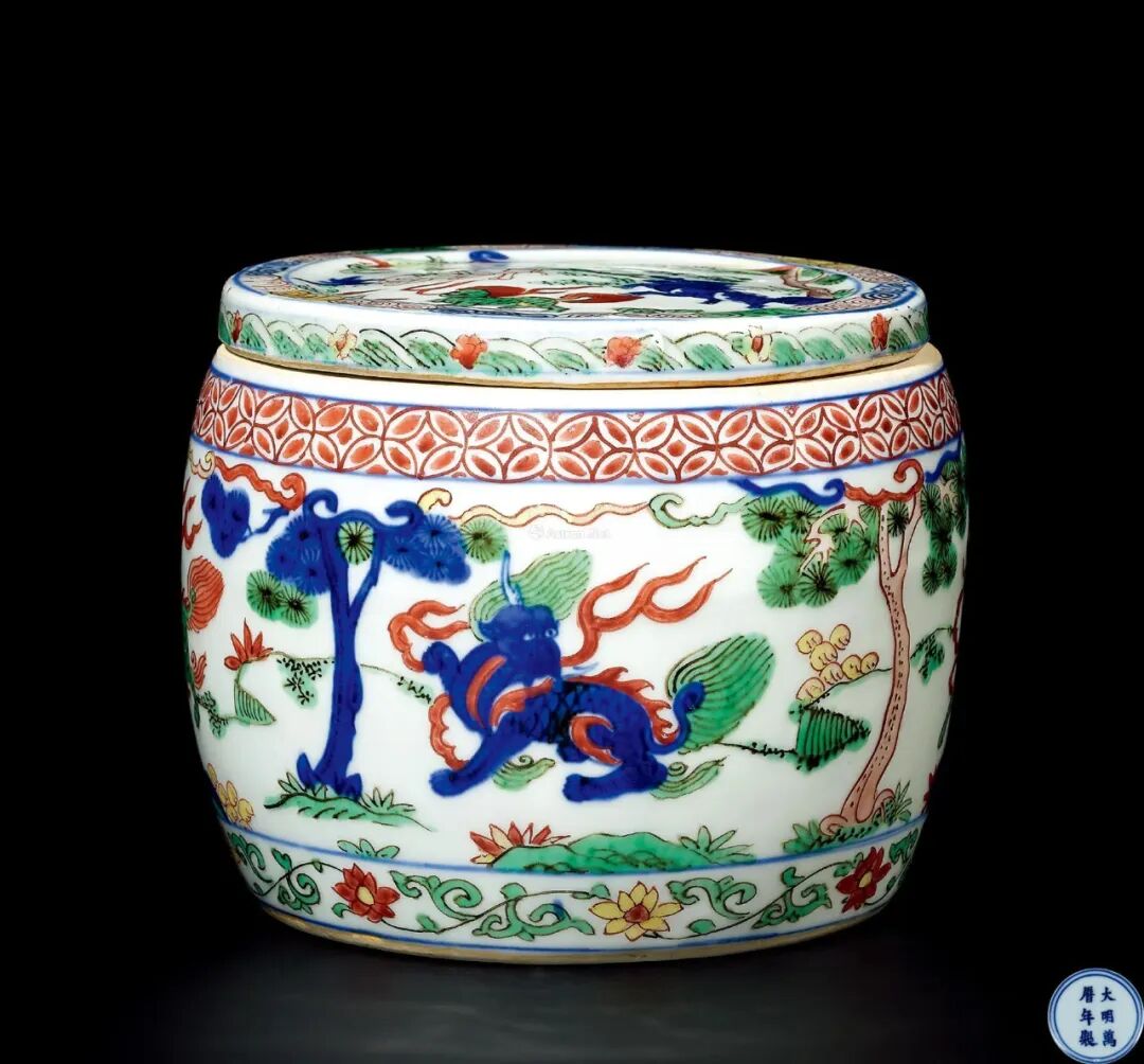 成化时期的御窑厂瓷器烧造日益兴盛,烧造品种繁多,有青花、斗彩、白釉、黄釉、蓝釉、釉里红、青花绿彩、黄地青花等,以青花瓷为主流。在瓷器烧制方面,成化一朝要求极其严苛,且不惜工本。考古挖掘出的大量成化瓷器残片,即可见其极度严格的筛选制度。由此,成化瓷器存世量相对较小。以台北故宫博物院为例,该院拥有宣德朝瓷器数约为1847件,而成化瓷器不足300件。《明史食货志》记载:「成化间,遣中官浮梁景德镇,烧造御用瓷器,最多且久,费不赀」。不计工本、仔细甄选,方有成化御窑瓷器无与伦比的品质,留存至今的每一件皆难能可贵。成化青花选用「平等青」料,呈色浅淡柔和,典雅宜人,纹饰采取双线勾勒填色绘制技法,画工规整,笔触秀丽,疏密有致,线条优美自然,给人以清新悦目,幽雅脱俗之感,备受世人所推崇。《竹园陶说》评论有:「成窑画笔古今独步,盖丹青妙手寄其心力于瓷片之上,故能笔细如发,用青如用墨,点染描画,各臻其妙也」。明人沈德符《敝帚轩剩语》有「宣窑品最贵,近日又重成窑,出宣窑之上」的赞语。许之衡《饮流斋说瓷》评价有:「成化五彩青花均极工致,青花蓝色深入釉骨,画笔老横,康熙就当却步也」。此形制的扁罐源自明初,承袭永乐翠青釉、白釉器之形,成化时期见青花、斗彩等品种,装饰纹样有莲塘水藻纹、牡丹飞蝶、九秋花草、缠枝莲花纹等。此罐所绘花草颇具自然意趣,似亦承自永乐时期,如土耳其托布卡比博物馆藏一永乐青花大盘,绘相似风格纹样,见《海外遗珍陶瓷》,1991年,页131。据考,成化后期所制多为斗彩天字罐。此种青花罐或主要出现于成化中前期。相似纹样也见于成化时期其他器类,如景德镇御窑厂成化晚期堆积层出土的一未完工的斗彩盒,以及北京故宫博物院藏斗彩盒的盒盖,见《成窑遗珍——景德镇珠山出土成化官窑》,香港,1993年,页84、182-183。![]()