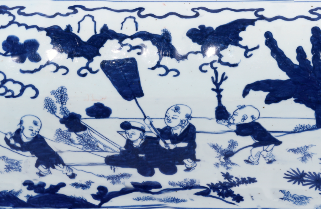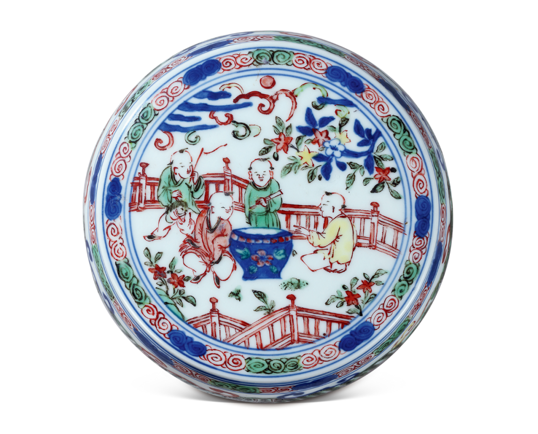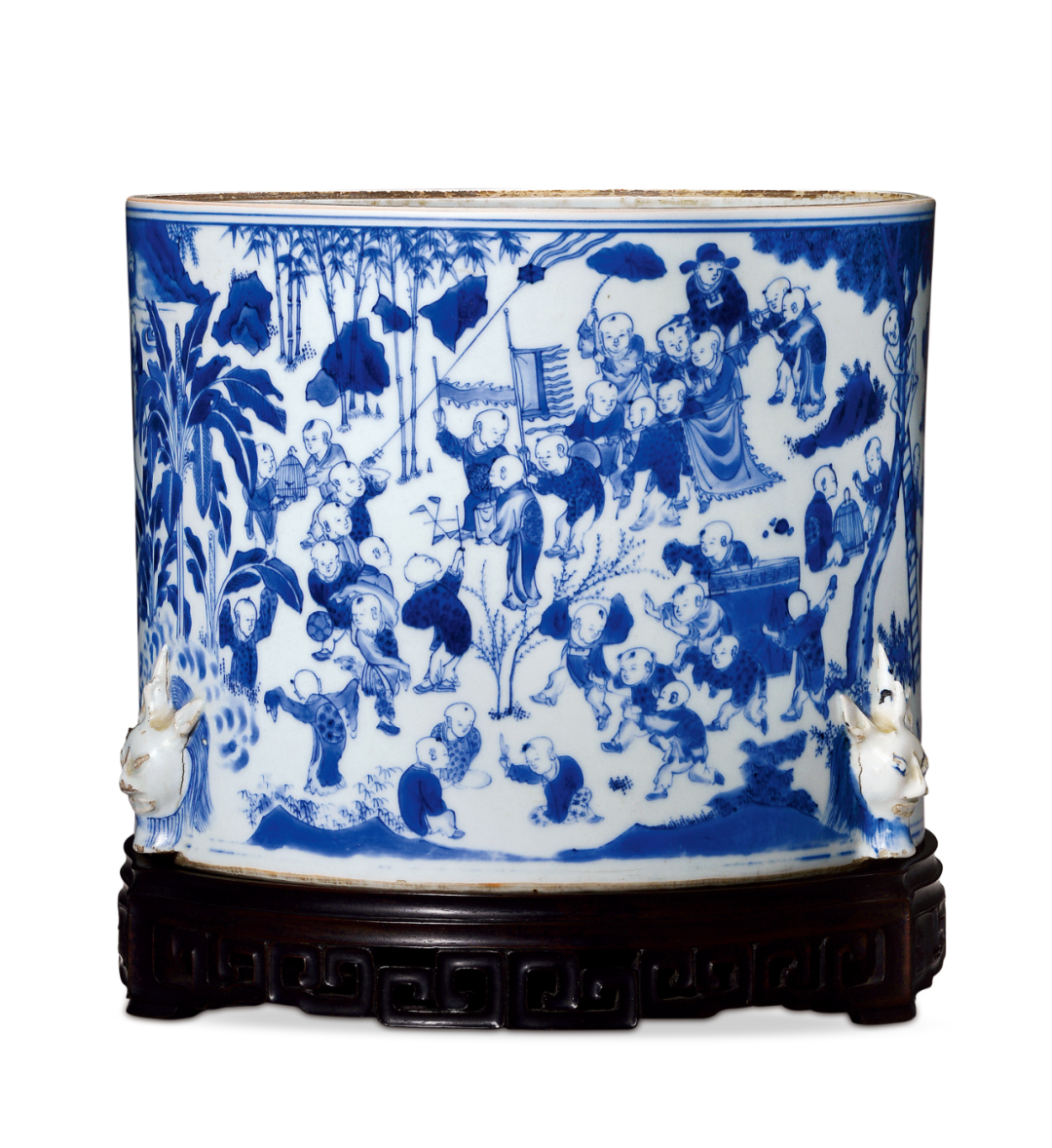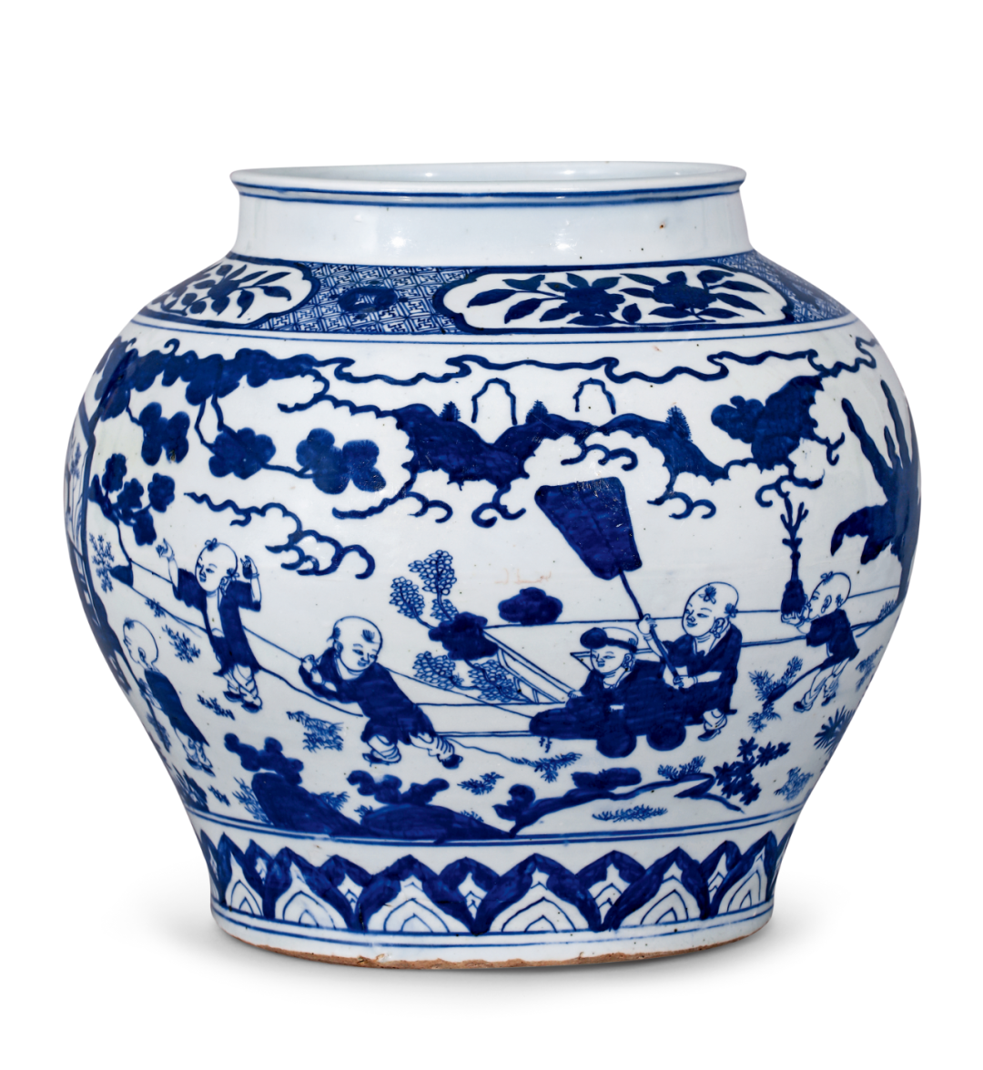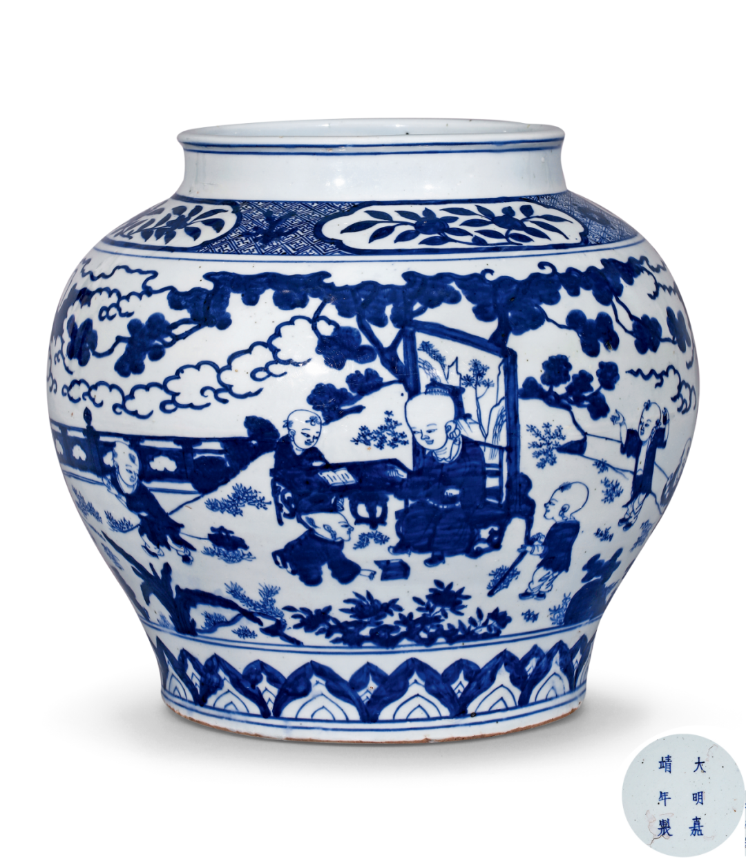 出版:保利艺术研究院,《保利拍卖十五周年精品集·古董珍玩卷(上)》,106页,编号124,2020年1.《明清美术》展,大阪市立美术馆,1980.10-11,1-592.景德镇御窑博物院、保利艺术博物馆,“青花的故事——景德镇御窑遗址所出与海内外珍藏元明青花瓷器对比展”,北京,2022年6月20日-7月9日"估价:RMB 6,500,000-8,500,000罐直口,短颈,丰肩,敛腹,圈足,通体绘青花婴戏图。众童子姿态各异,活泼可爱,三三两两相簇,或坐而刻苦攻读,或嬉戏游玩,有的拖车,有的斗蟋蟀,有的骑竹马,形象地表现出儿童在嬉戏中生动活泼的姿态,各个生动传神。肩部饰一周「卍」字纹锦底,等距开光内绘折枝花果,足墙为莲瓣纹,器底正中书「大明嘉靖年制」六字双行楷书款。嘉靖时期,青花以回青为原料,色泽鲜艳明亮。此器胎骨厚重,釉色肥腴莹润,甚具嘉靖青花的时代特色。嘉靖朝瓷画风格以古拙著称,画面富有童趣,随意、夸张,对后世的瓷画风格有极大的影响。嘉靖时期婴戏图的表现内容较前朝明显增多。而此题材表现儿童的天真烂漫,与受儒家教育的中国传统文人澹泊的思想符合,也与道教所推崇的无欲思想所契合,显示万历帝崇敬道教的时代特征。类似的青花庭院婴戏纹罐,均被重要博物馆纳入收藏,故官博物院藏一例,且带有原盖,录于《故宫博物院藏文物珍品全集—青花釉里红(中)》,商务印书馆(香港)有限公司,2009年,页110,图101;东京出光美术馆亦藏一例,无盖,录于《馆藏名品选第一集》,出光美术馆,东京,1986年,图版147。胡惠春家族亦递藏一盖罐,后入香港徐展堂静观堂雅蓄,多次见于拍场,最后一次售于香港佳士得, 2007年11月27日,编号1738,港币3056万成交。
