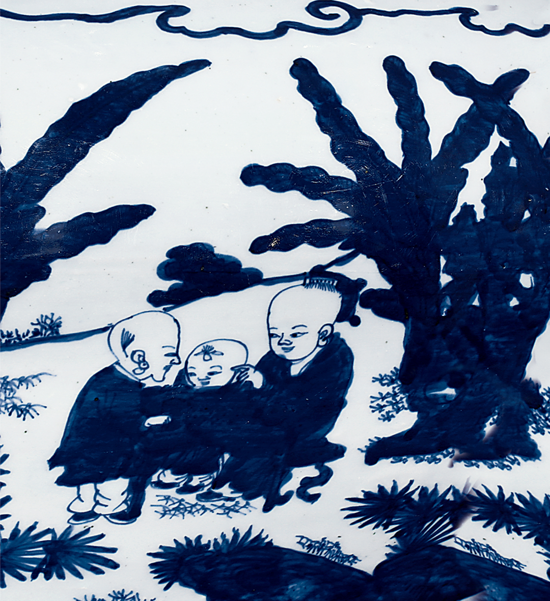 本品正是一份反映嘉靖皇帝此番信仰之例证,其主题纹饰独特,通景绘饰“蓬头四仙”图。画中所绘铁拐、刘海、寒山、拾得四仙,秃顶披发,因皆不施巾帻,谓之“四蓬头”,为元明时期民间喜闻乐见的艺术题材,正是源于嘉靖皇帝对道家的推崇,“蓬头四仙”题材才得以首次出现在明代官窑瓷器之上。本品所绘四仙布置错落,姿态各殊,形骨古野,怪戾骇俗:铁拐李侧首仰视,双目有神,一手扶持拐杖,一手托着葫芦宝物;寒山笑容盈盈,双手执卷而立;刘海手舞足蹈,嬉戏金蟾;拾得手携扫把,欢喜前行。纵观全图,放笔纵墨,轻盈飘逸,诸仙情势具佳,形象诡怪,得妙趣于天然,一如明初名家商喜之作《四仙拱寿图》,运笔刚劲有力,气势挺健,饱满而富有弹性,自见飘逸之气。对四仙的嘴、眉、颧骨均加以强调,使形象更具冲击力和生命力,尤其对嘴部的夸张表达,突出了“笑”态,增强了画面的喜庆气氛,予人观之,忍俊不禁,深受感染。