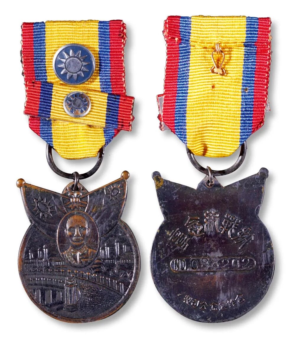 此章於民国三十五年(1946年)十月颁行,为襟绶,有表,不分等级,颁给在抗战期间服务於军、公人员。保存完好,少见。