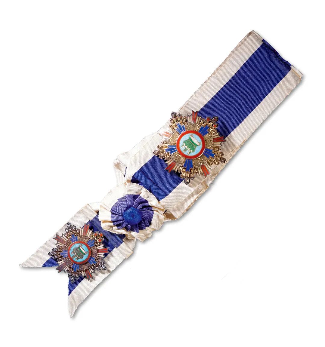 国民时期一等特种大绶宝鼎勋章正、副章一套,带原绶带。