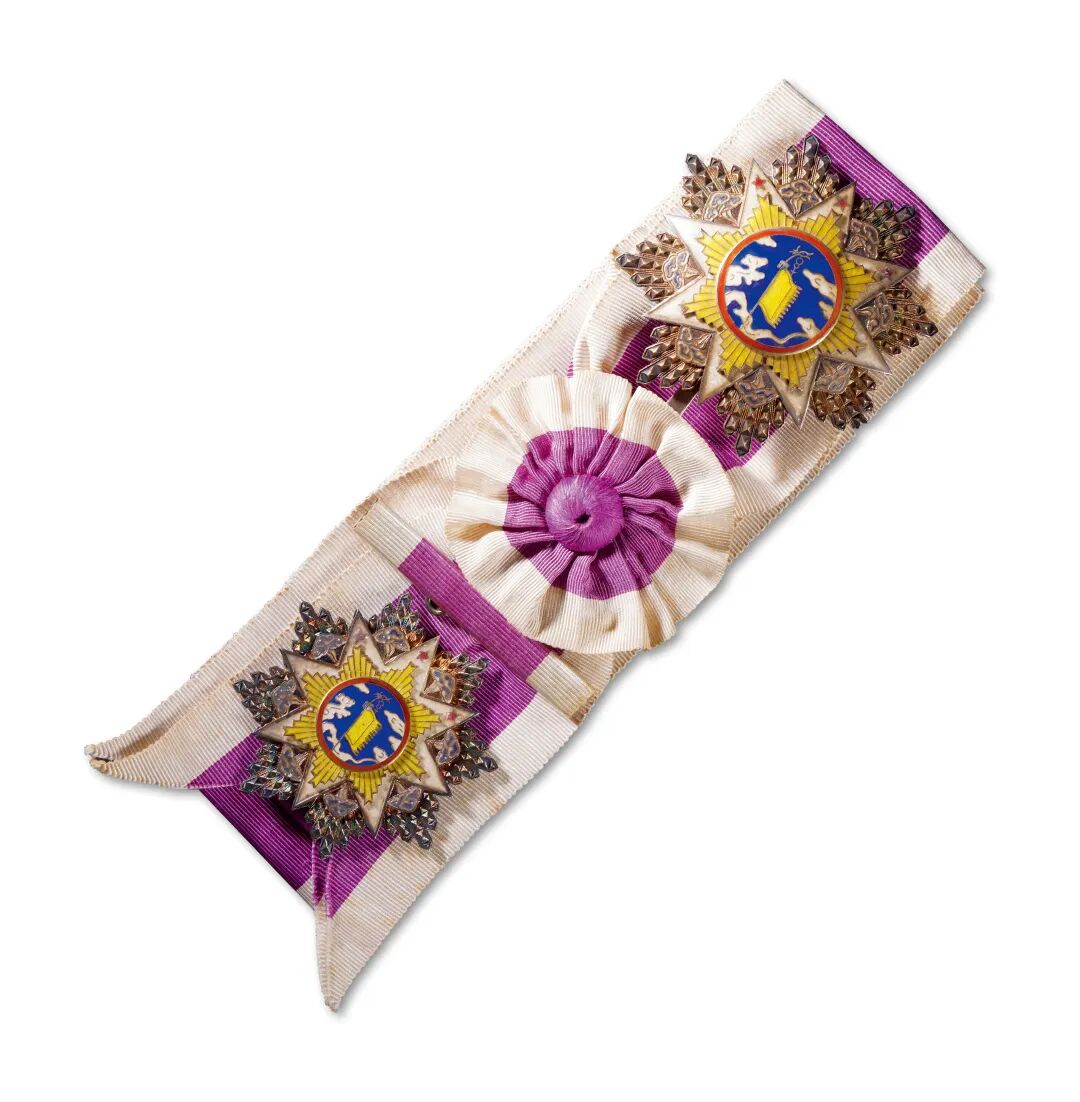 国民时期一等特种大绶云麾勋章正、副章一套,带原绶带。