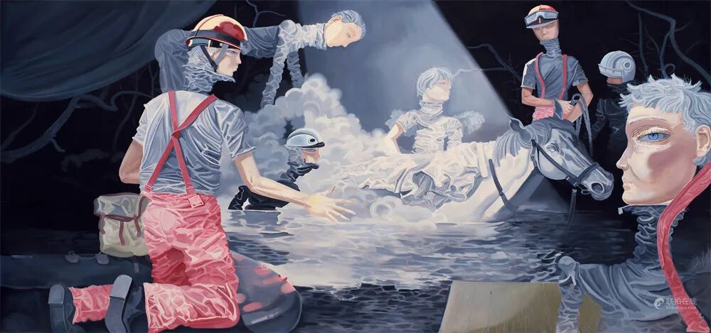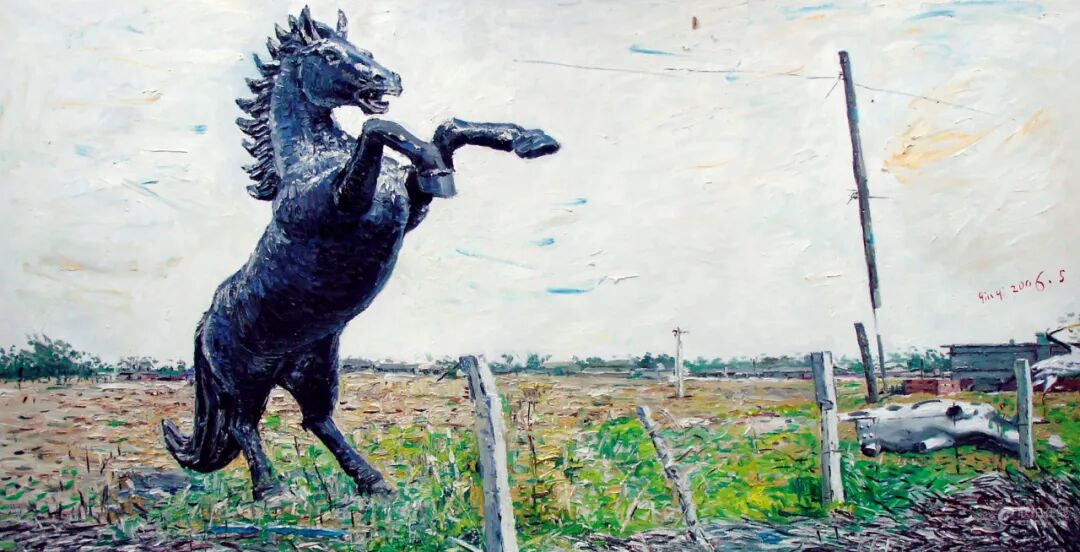 《奔马》以超现实的艺术语言方式,将骏马以及多种图像碎片化地设置在同一个场景之下,呈现出时间、空间上错序的语境。而在碎片化之间有着纪实与虚构、移植与混合的视觉修辞,构成了作品中荒诞的意味,由此产生了一种不可理喻的迷局和悬疑,同时亦是对现实与历史的暗喻。