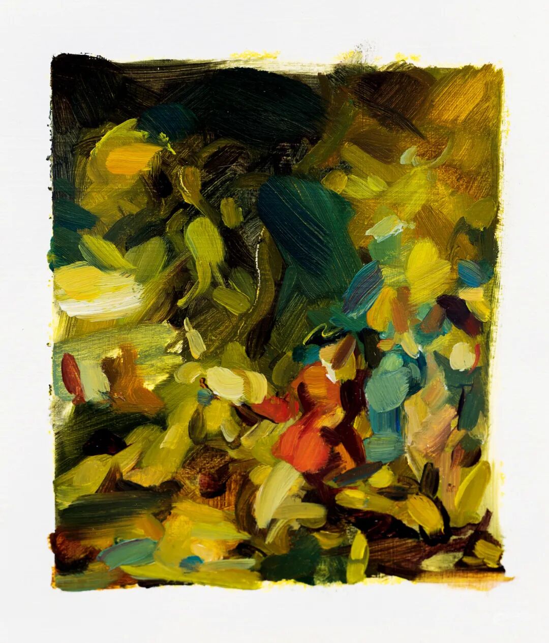 《研习》的色彩充满了18世纪油画中深秋森林的味道,黄色与绿色的厚重笔触交叠出如同树林与落叶的质感,中间红色的人形轮廓不禁让人联想到身穿欧洲古典服饰的男子。她的笔触中能让人看到她挥笔的运动轨迹,在笔触轻重变化中,呈现一种带有韵律节奏的视觉体验。