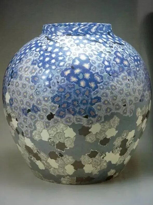 松井康成将青、黑、黄等不同的色土与渐变效果并用,使作品进一步层次化,创造了“象裂瓷”加饰方法。