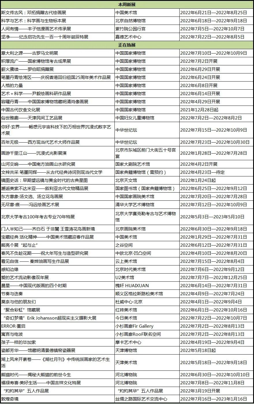 本次展览由北京自然博物馆、天津自然博物馆联合策划,共呈现超过100件科学画和生物标本,采用画作与对应标本并列展出的形式,向参观者普及动植物知识。展览时间:2022年6月18日—2022年9月18日本次展览以“人间有情”为主题,展示丰子恺、丰一吟、宋菲君丰氏三代人的漫画、书法作品一百余幅,同时,展出丰子恺先生的恩师弘一法师的三幅书法作品,以及丰子恺先生的写生画稿、丰氏家族的影像资料等。展览时间:2022年7月5日—2022年10月7日本次展览从家事、师事、鉴事、余事、正事五个部分全面展现了启功先生的人生轨迹和艺术成就。展品全部来源于启功先生自藏,无借展作品,共计一百一十种。展品真实可靠,本次展览从规模数量上,内容的丰富性上,作品的艺术水平上,当属第一。展览时间:2022年7月22日—2022年8月5日“意大利之源——古罗马文明展”亮相中国国家博物馆,展出来自意大利全国26家国家级博物馆的308套共503件珍贵文物。该展览以中、意、英三种语言进行呈现。展览时间:2022年7月10日—2022年10月9日展览内容涉及国家博物馆主持或参与的约70个考古发掘和调查项目,重点展品包括江苏韩井遗址出土的距今8500-8000年的炭化稻、山西垣曲商城出土的商代青铜鼎、甘肃礼县大堡子山遗址出土的秦子镈、河北钜鹿宋城出土的宋代青白瓷瓜棱式执壶、「南海一号」沉船出水的外销瓷器等。此次展览精选罗伯昭捐赠文物珍品170件(套),通过“泉坛巨擘 沐园寄怀”“爱国义举 垂范后世”“不负重托 笃行致远”三个单元,系统展示罗伯昭的重要泉币收藏和学术研究工作,展示中国国家博物馆在钱币文物征集、收藏、保护、研究、展示等方面取得的重要成果。笔墨丹青绘湾区——庆祝香港回归祖国25周年美术作品展
