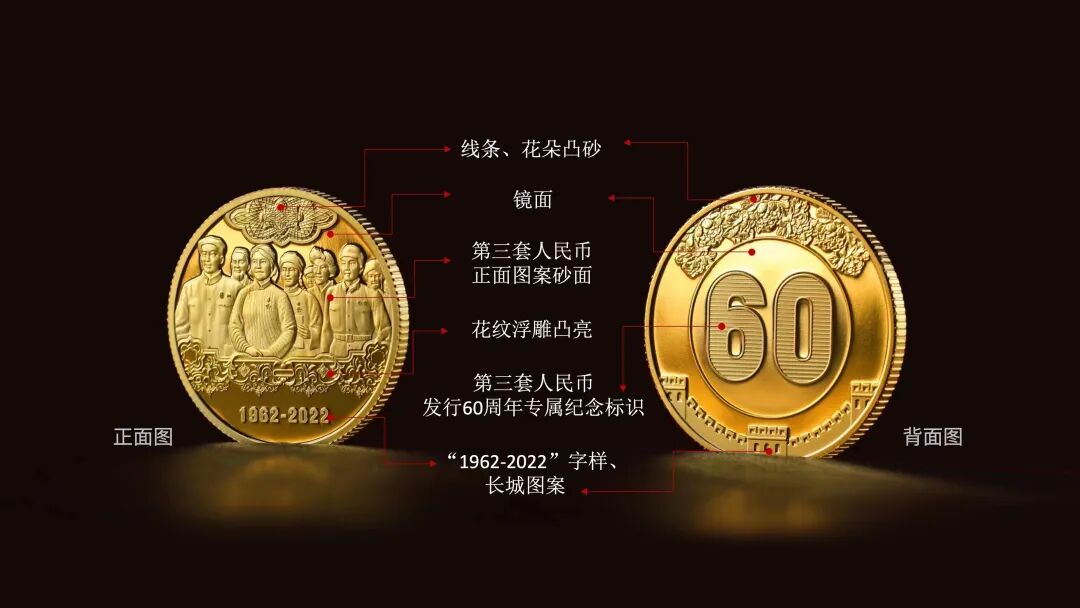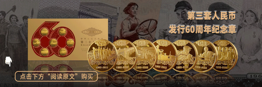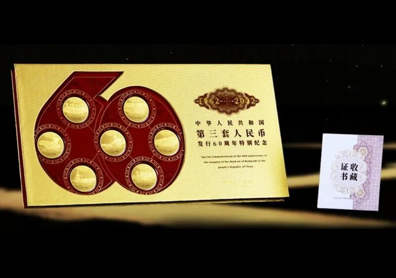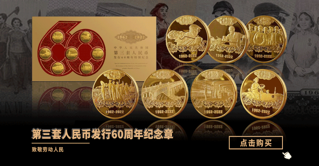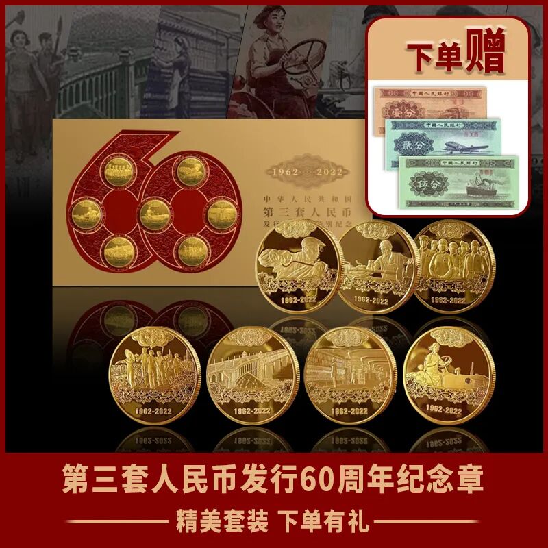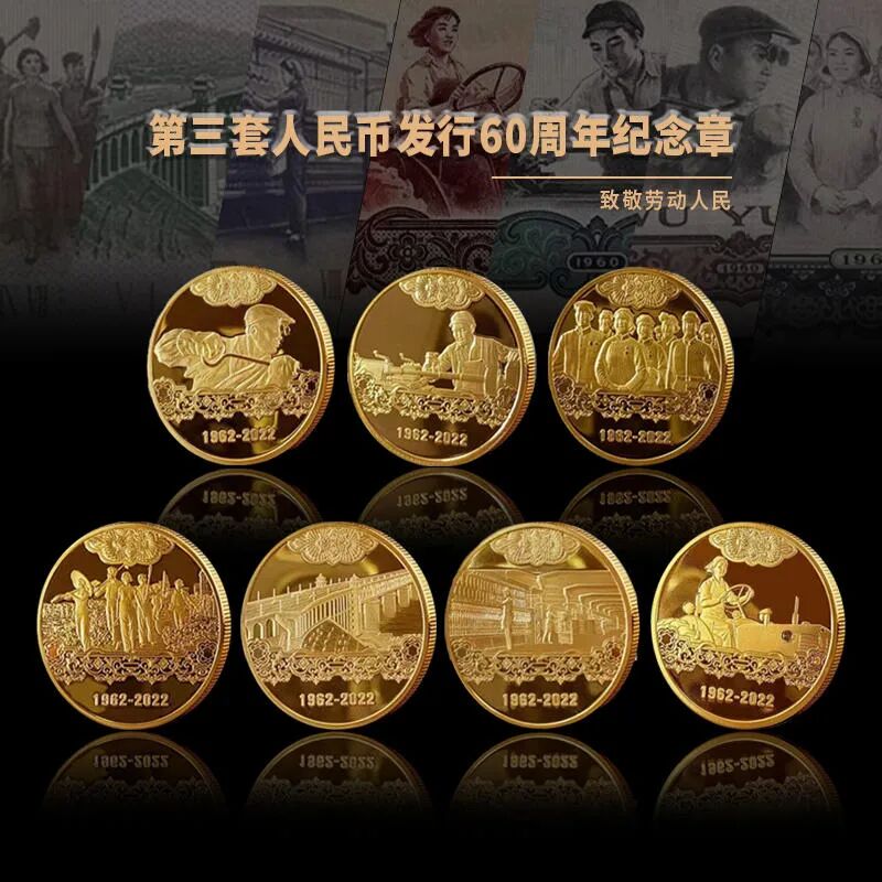 为纪念第三套人民币发行60周年,经中国人民银行营业管理部行政许可图样使用后,装帧出品的第三套人民币发行60周年纪念章一套,该套纪念章共7枚,材质为铜镀金,直径27mm,限量发行1万套!