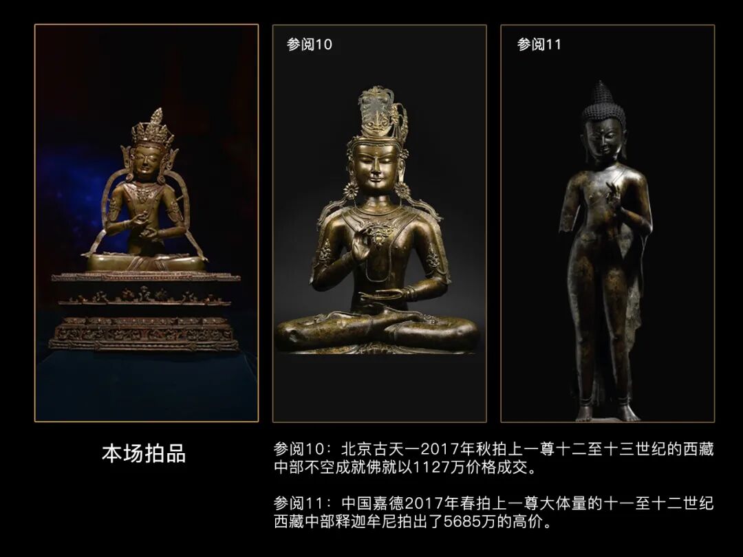 从艺术风格上看,此尊十一面观音像是典型的15世纪西藏中部作品。藏中风格主要是指流行于明清时期的西藏山南和拉萨等地。这一风格继承了尼泊尔、藏、汉多地的艺术特色,集大成于一身,此尊造像比例完美,做工细致,且融合了多地艺术的精华,是藏中佛像中令人惊叹的杰出代表。15世纪左右的十一面观音极为罕见,价格往往不菲,纽约邦瀚斯2018春拍,一尊15世纪十一面观音,成交价达120万美元之巨;而早在2010年纪北京匡时春拍,一尊14世纪的十一面观音,就以168万人民币的高价释出。本尊造像法相庄严,其精湛的铸造工艺与镶嵌工艺给人无与伦比的审美感受,为同题材中难得之精品,与前文示例的诸多同题材造像相比有过之而无不及,具有极高的收藏价值,值得各位藏家关注。