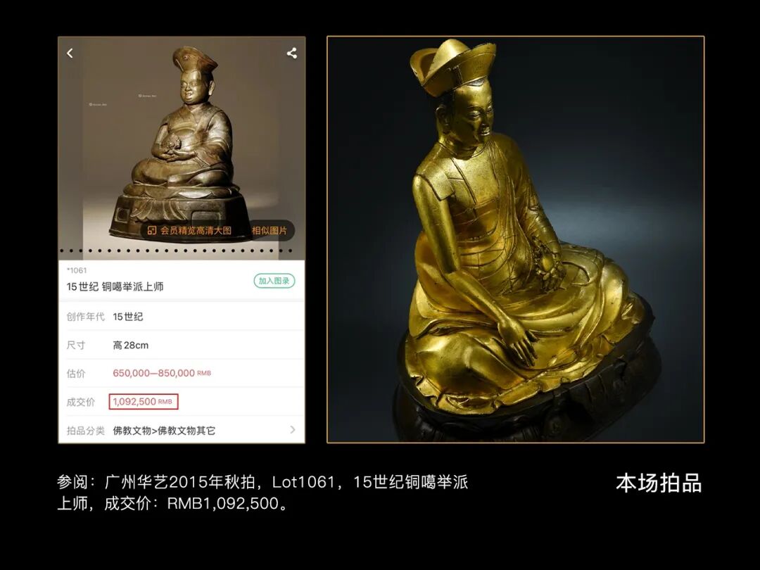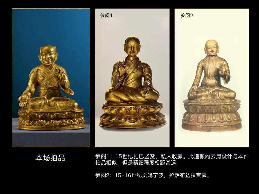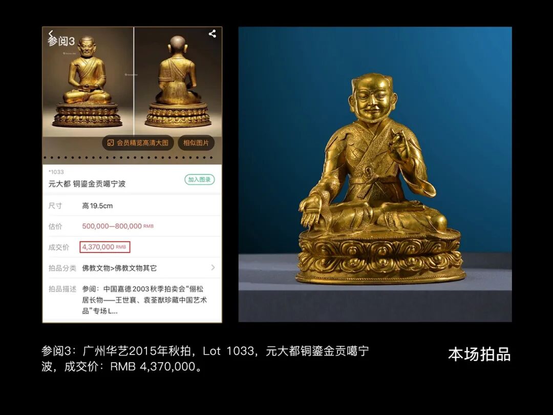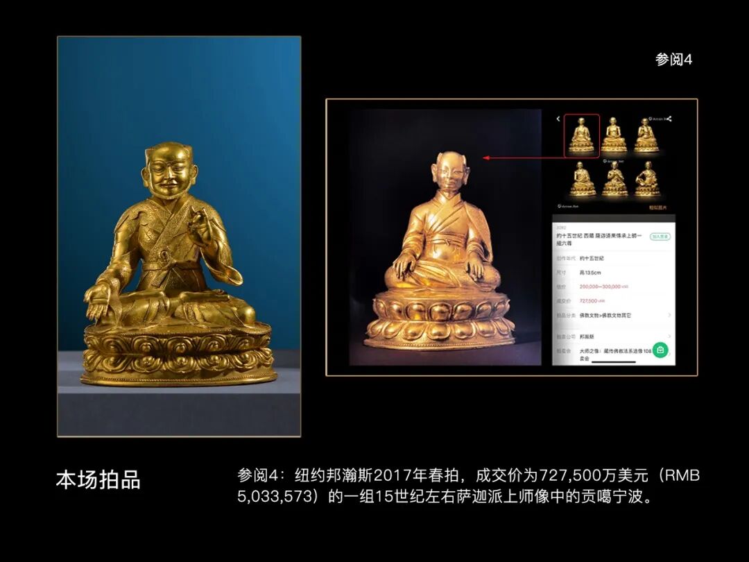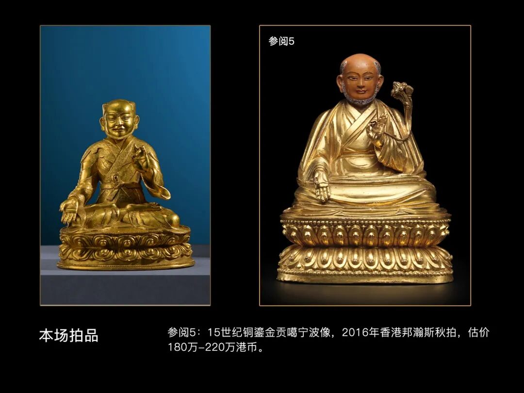 贡噶宁波这一题材在藏传佛教浩如烟海的上师造像中并不多见,而如此精美的更为稀少,因此此类题材的精品造像历代都是市场关注的重点,广州华艺2015年秋拍一尊元大都风格铜鎏金贡噶宁波,以437万的高价引发行业热议;纽约邦瀚斯2017年《大师之像:藏传佛教法系造像108尊专场》中一组六尊15世纪左右的萨迦派上师像,也以500万人民币的价格释出,其中就有一尊贡噶宁波像;2016年香港邦瀚斯秋拍一尊15世纪铜鎏金贡噶宁波像估价达到了180万-220港币,可见市场对该题材精品造像的看重。