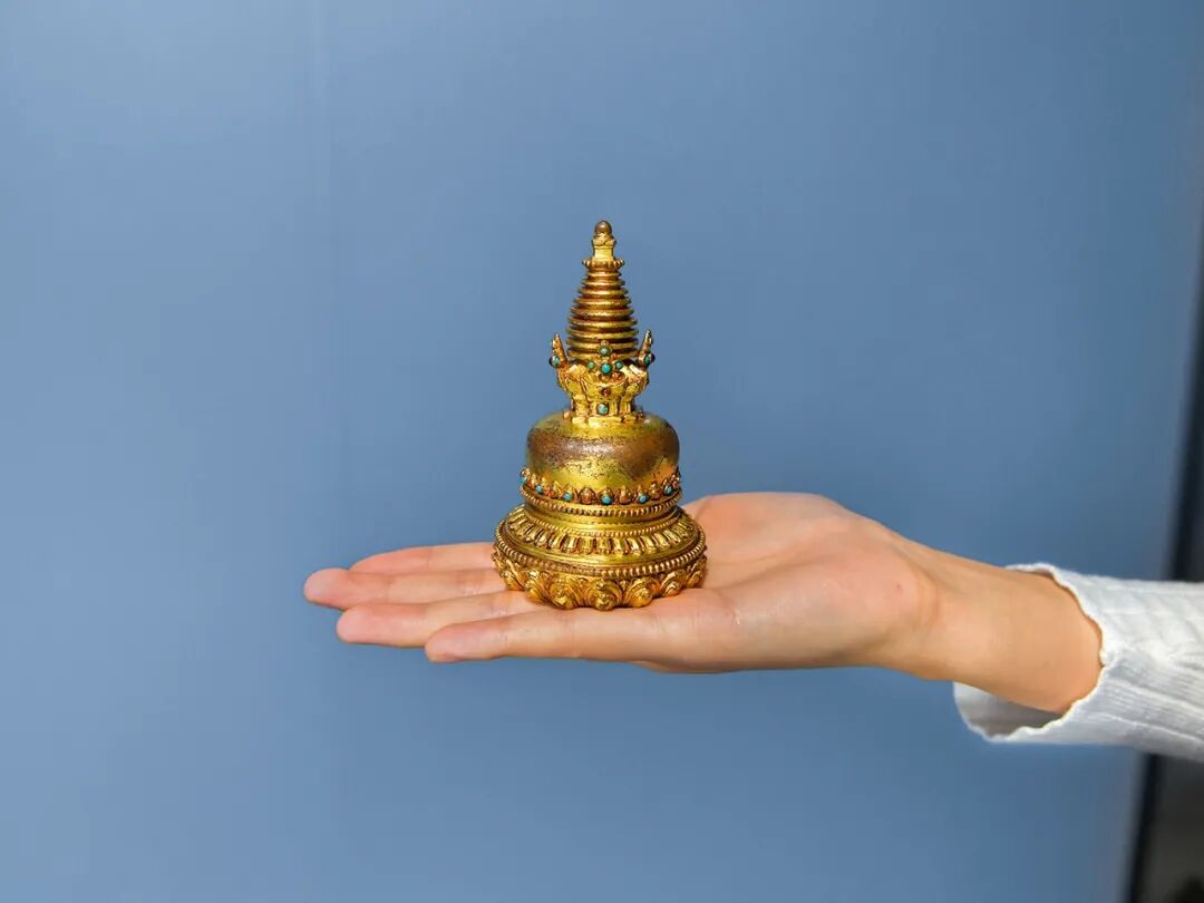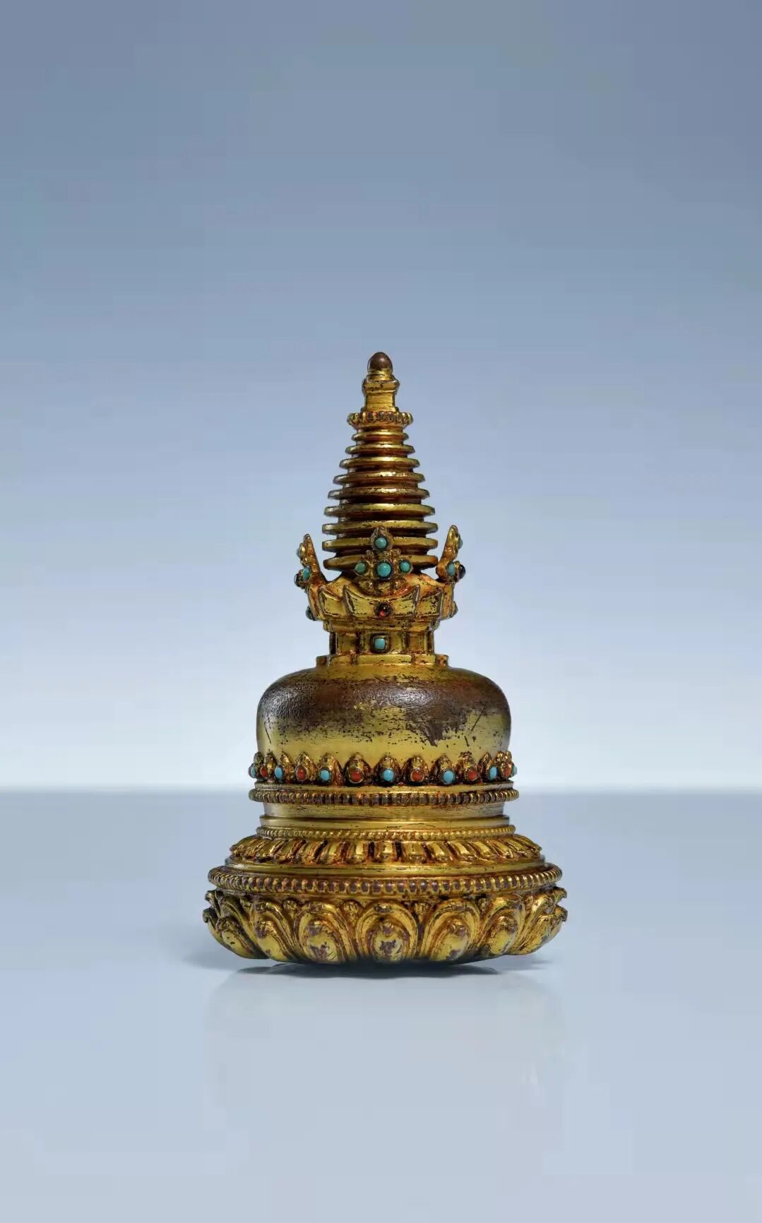 Lot 20 尼泊尔十六世纪 铜鎏金嵌宝石舍利塔佛塔在藏语中,塔称为“却丹”,在梵语中称为“苏堵波”,中文叫浮图、浮屠或佛图,意译为方坟、圆冢等。它是印度佛教中埋葬佛骨和圣徒骨骸的坟冢。我们常说“救人一命,胜造七级浮图”,这个浮图就是指佛塔,而浮图其实就是佛陀之变音。此件佛塔最下方为塔基,环绕一圈挺阔的莲瓣,立体厚重,瓣尖微微上翘,宛如盛开的莲花。其上方点缀着连珠,圆润饱满,颗粒分明,可见工匠进行了极为细致的打磨。其上方塔身边缘錾刻着一圈莲瓣,棱角分明。其上方呈半球形的覆钵状,浑圆饱满,装饰一圈摩尼宝,嵌几十颗各色宝石,包浆莹润迷人,铜质细腻,色泽明亮干净。塔向上逐层收分,形成叠涩式方形台座,四方装饰镶嵌宝石的摩尼宝;之上塔刹为十三级相轮,代表成佛的十三金刚地。此件舍利塔保存完好,品相完美,造型繁复,线条优美流畅,装饰多种宝石,真可谓是华美大气,像这种佛塔,无论是从工艺水准、艺术性和宗教性来说都具有极高的收藏价值。
