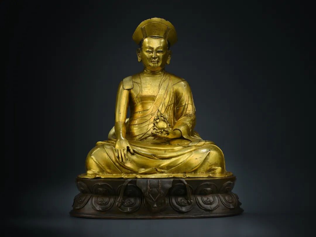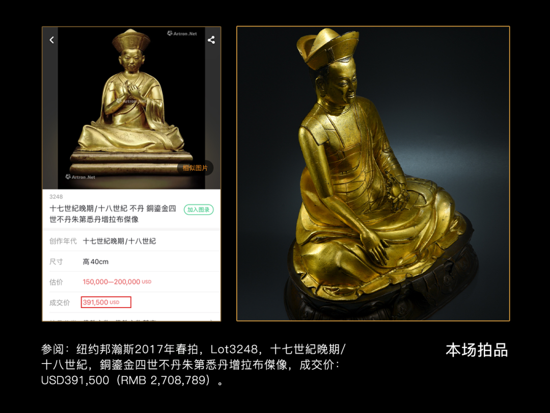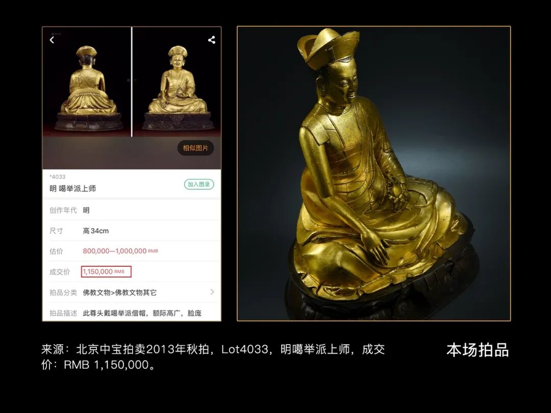 尊上师有二点值得我们特别关注:一、此尊造像尺寸巨大,高达34厘米,气势恢宏,在西藏的上师造像中极为罕见。另外此尊造像传承有序,历经多次递藏,曾在2014年北京中宝拍卖中以115万的高价成交。第二、此尊造像为分体铸造,身体为红铜铸造并施以厚重的鎏金;底座为合金铜铸造不鎏金,这在同类造像并不多见。以上亮点就确定了此尊造像与众不同,在存世量较大的上师像中此类罕见的且来源清晰的造像更应该受到藏家们的青睐。此尊上师体态丰腴,呈稳定的金字塔式结跏趺坐,这种传统的稳定构建足以体现上师像所得到的尊崇地位的显赫,犹如建筑里程碑式样的矗立。上师头戴折沿式僧帽,法帽层次清晰,正中錾刻莲花纹饰,凸显上师尊贵的身份。脸庞轮廓分明,额际高广,面容和善,双目炯炯,眉弓与鼻梁立体坚挺,颧骨凸出,表情沉静沉稳,极尽写实之能事。上师肩宽胸厚,躯体挺拔健美,四肢硬朗有力,尽显庄严殊胜之相。藏传佛教教派众多,不同教派中又有海量上师像存世,相较主流的格鲁、萨迦和噶玛噶举派,更多小众教派的上师则更受市场追捧。眼前这件极富神韵的造像,就是非常罕见的主巴噶举派上师像。因为存世稀少主巴噶举派上师像一直是市场热点,2017年邦瀚斯纽约春拍<大师之像>专场中一尊17-18世纪主巴噶举四世不丹朱第悉丹增拉布傑像就创下了39.1万美金,约合人民币270万的佳绩;2015年广州华艺秋拍的15世纪主巴噶举上师也以过百万的价格成交。