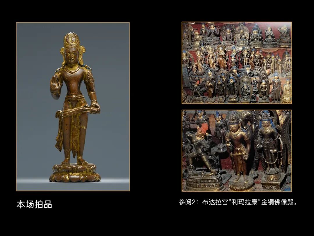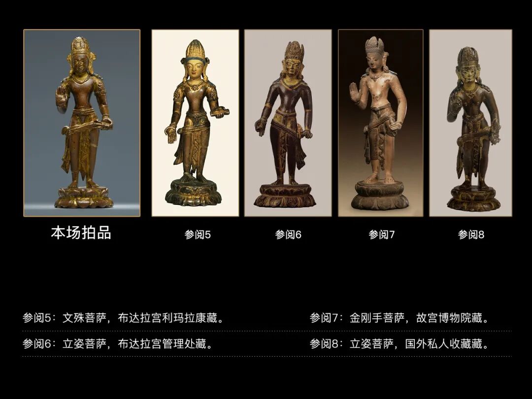 施罗德《Buddhist Sculpture in Tibet:Volum 2 Tibet and China》书中收录一件保存于布达拉宫的文殊菩萨,尺寸与本件作品几乎一致;布达拉宫管理处藏有一件立姿菩萨;一例金刚手菩萨藏于故宫博物院,应当为西藏进贡,且尺寸与本件作品几乎一致;另见一例国外私人收藏,以及布达拉宫利玛拉康所藏一尊并未被施罗德先生收录进书中的金刚手菩萨。以上五例作品与本尊阿索道夫金刚手菩萨有着高度一致的身体比例和同样缺乏动态感的形体,以及相同的传世状态,从图像上来说这一组造像更接近前文例举的敦煌绢画,而非产自于加德满都的标准器。我们有理由相信,雕塑技艺精湛的纽瓦尔艺术家在公元7世纪的吐蕃早期开创的艺术范式为之后的藏族工匠所继承,供奉于大昭寺、布达拉宫的理查维雕塑持续不断的为本土艺术家们提供创作蓝本,同时在尼泊尔艺术的基础上吸收来自中亚、唐代中原等地的艺术风格,从而创造出西藏帝国最古老的佛教艺术。