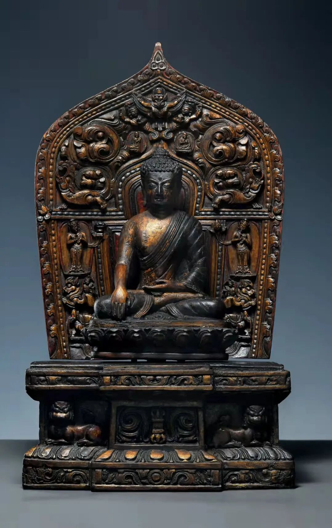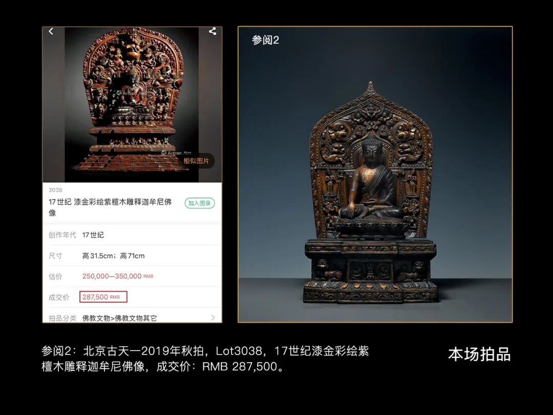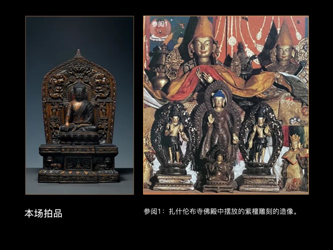 Lot 3 18世纪 紫檀木雕扎什伦布寺风格释迦牟尼佛尺寸:整体高约42.5cm,宽约24.5cm;佛像高约21cm,宽约15cm整尊造像造型准确,雕刻利落娴熟,彩绘细腻华贵,,整体透着扎什伦布寺独有的风韵,参考一张扎什伦寺的老照片,可以看到图中前排的三尊立佛是紫檀雕刻的,以紫檀为材也是该寺造像的特征。此尊释迦牟尼全跏趺坐姿,头饰螺发,肉髻高隆,宝珠顶严。略带甜美的圆润童子脸,清秀端正,五官紧凑,高鼻薄唇、眼睑低垂,表情静穆柔和,略含笑意,白毫凸出,双耳垂肩,面相祥和,神情内敛静谧,威严大度莫不叫人敬仰膜拜!造像上身端正,胸部挺拔,肌肉结实,力量感明显。着坦右肩式袈裟,衣纹简约流畅,层次分明,使得像身优美的曲线得以展现。大鹏的神秘、瑞兽的威猛、大象的憨厚、菩萨的慈悲,在古代匠人那鬼斧神工的技艺下表现的完美无瑕,神态生动呼之欲出。整躯造像体量硕大,品相完美,由于寺内藏香及酥油灯的长期熏炙,在像身表层形成了一种特殊的包浆,色泽醇厚而自然,微有芳香,深沉古雅。