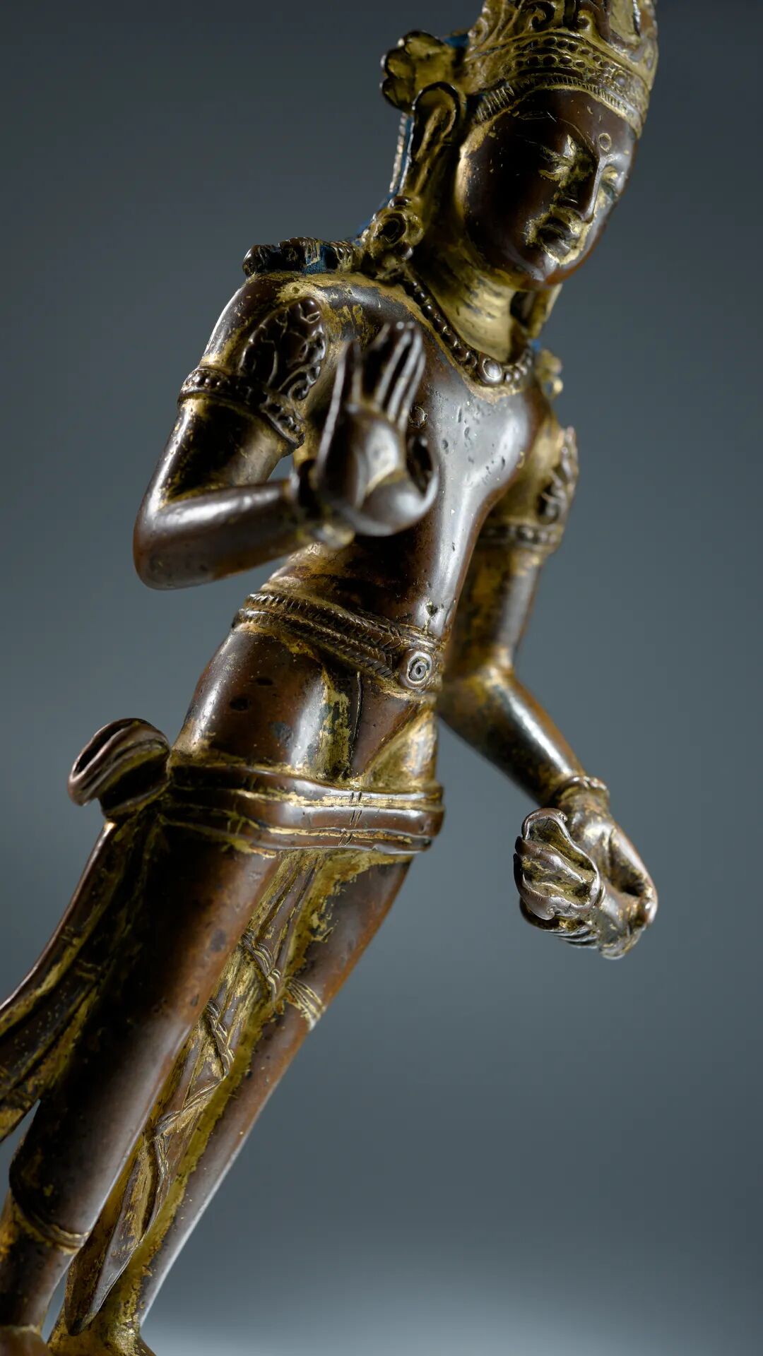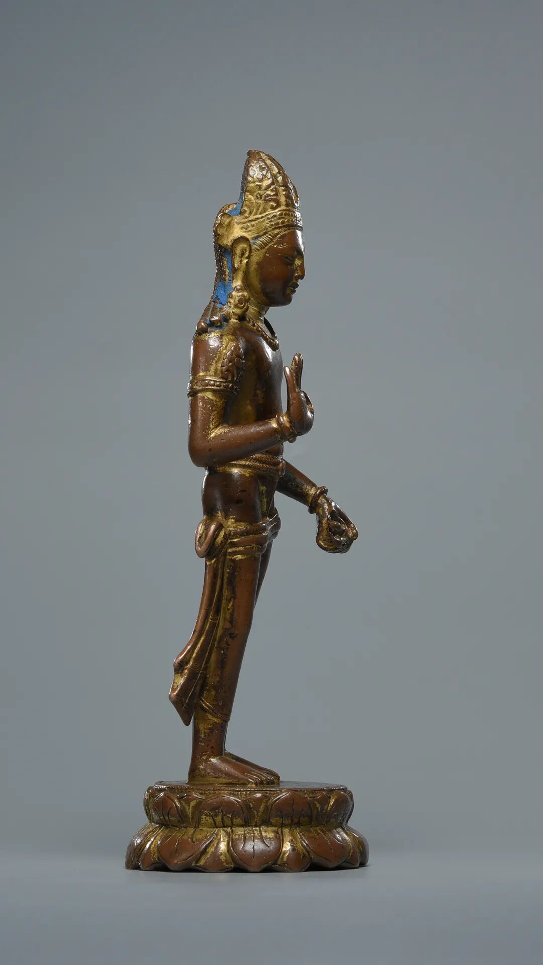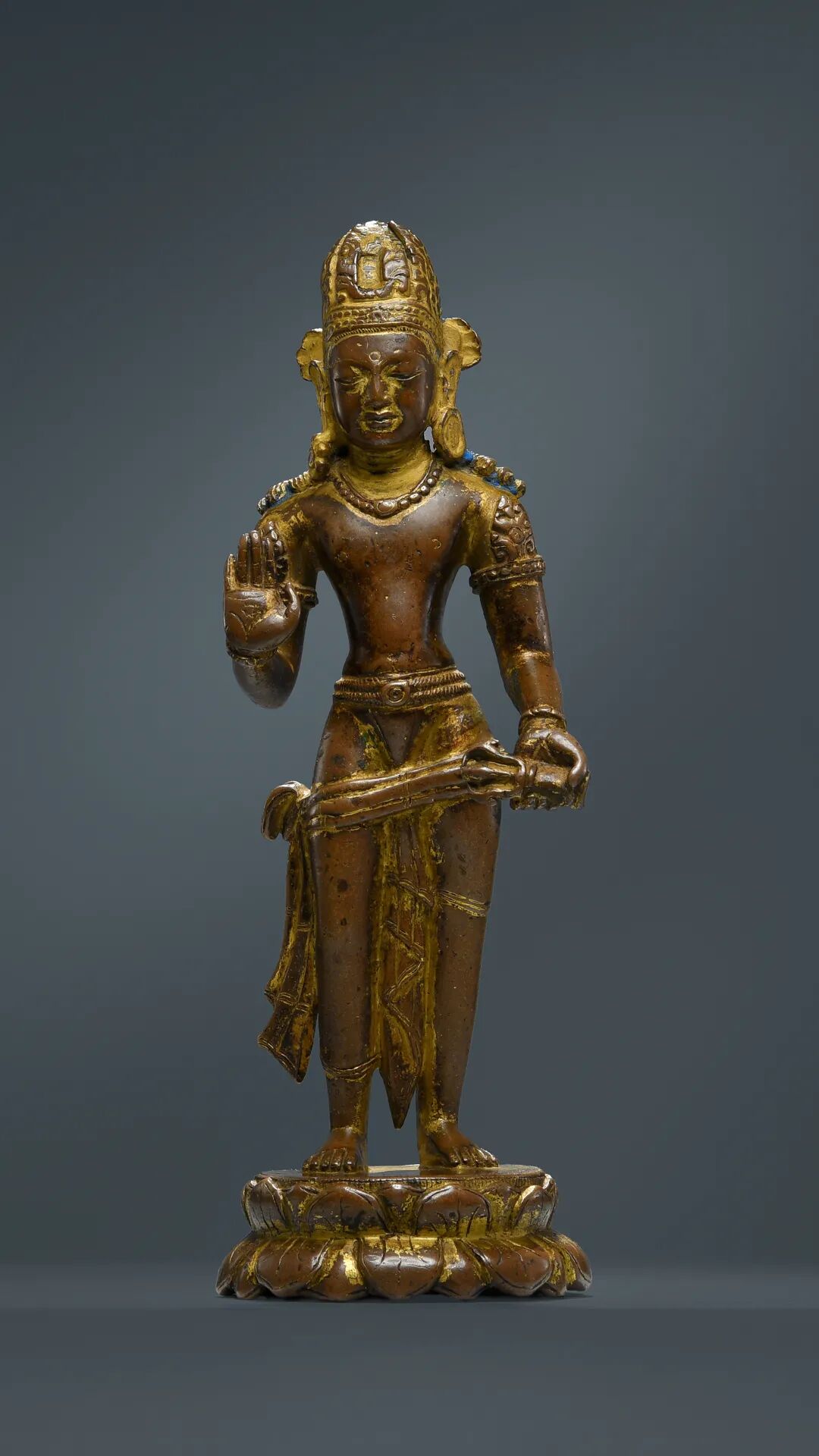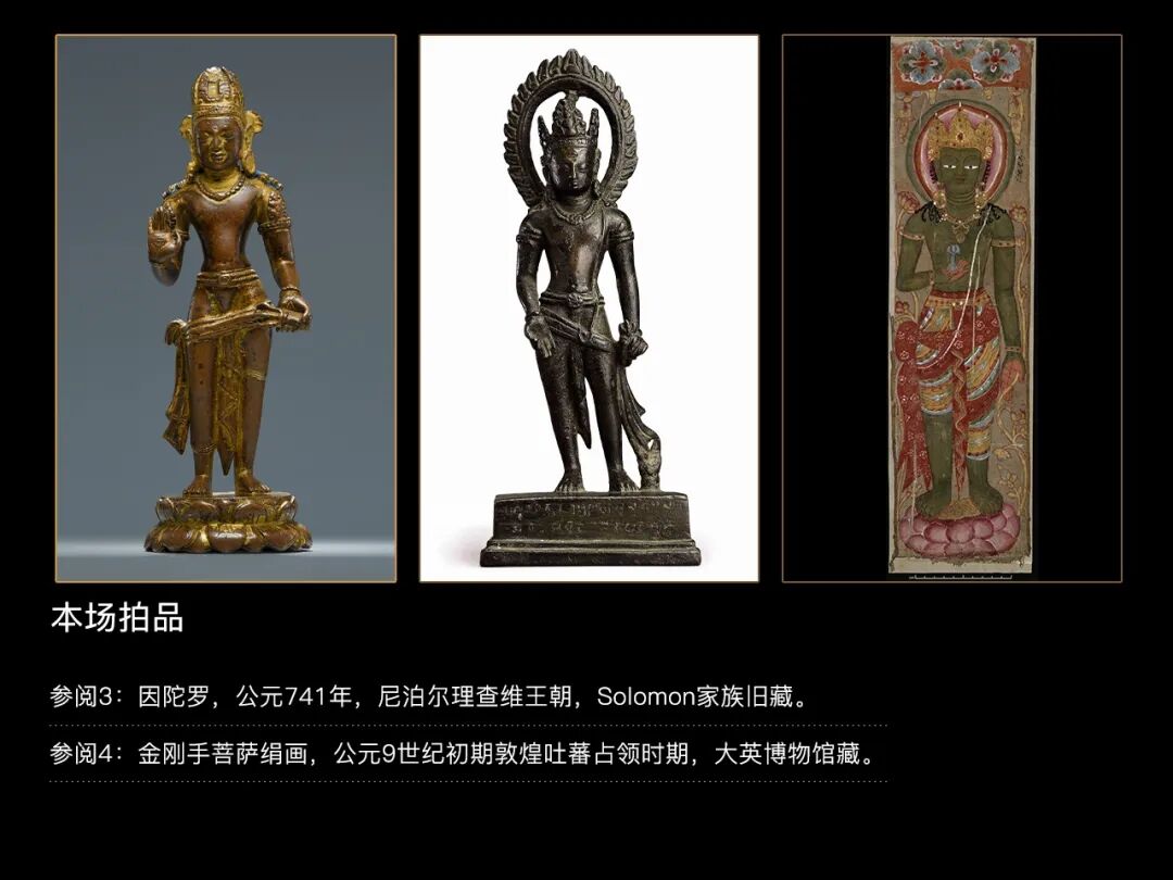 Lot 25 西藏 公元8-9世纪 吐蕃遗珍 吐蕃王朝理查维风格 金刚手菩萨1、购自Kapoor Galleries,纽约,1984年10月4日。2、詹姆斯及玛丽莲·阿索道多夫伉俪珍藏,芝加哥,佳士得2020.9.24此尊金刚手菩萨头戴三叶法冠,帽冠两侧结花型冠结;菩萨大耳垂肩,双耳分别佩戴造型不同的耳铛,表现出喜马拉雅古典美术的审美偏好;鼻梁挺拔,嘴唇较窄且丰满厚实,符合早期佛教度量;菩萨躯干挺拔,宽肩,细腰,上身呈倒三角形,胸部、小腹处可见自然优美的肌肉轮廓。左手持三股金刚杵,这是早期佛教美术中广泛流行的样式,其线条犀利,充满张力,体现出金刚手菩萨力量与慈悲的特质;右手举于身前,手掌向外施无畏印,象征布施无怖给众生。下身着古印度男子特有的裙裤(dhoti),裙裤呈不对称样式,一高一低,这一设计是尼泊尔理查维王朝至过渡时期的特有样式,极具时代特征;底座为圆形仰覆式莲瓣,莲瓣较为扁平,其上刻川字纹,呈现出典型的尼泊尔理查维风格。整尊造像采用高纯度红铜实心铸造而成,造像历经一千余年传世,表面的鎏金已磨损殆尽,仅在缝隙处有些许的残留,与古朴的红铜产生强烈的视觉对比。值得注意的是,此尊造像虽然呈现出十分具有辨识度的理查维风格,然而其光滑莹润的皮壳并不符合尼泊尔造像供奉仪轨所造成的传世状态,面部残留的泥金和发髻染蓝说明其曾经供奉在西藏的寺院,在身型塑造方面亦与尼泊尔加德满都传世的标准器有细微差别,种种迹象表明,此尊金刚手菩萨极有可能与尼泊尔理查维王朝同时期的西藏吐蕃帝国有着千丝万缕的联系。根据藏文史料记载,大昭寺最初共建有八个佛殿,内部除了供奉赤尊公主从尼泊尔迎请的释迦牟尼八岁等身像、弥勒佛、圣救度母等佛菩萨像外,还有尼泊尔工匠塑造的世间自在。这一历史资料表明,在大昭寺修建时,就已经有尼泊尔纽瓦尔工匠在拉萨铸造佛像,那么这一时期所创作出来的雕塑也必然为纯粹的尼泊尔风格,可以说,尼泊尔艺术奠定了7世纪西藏本土艺术的基调。大昭寺至今仍旧保留有来自公元7世纪吐蕃时期由纽瓦尔工匠所创作的理查维风格木质门楣浮雕。根据著名学者冯·施罗德先生上世纪前往布达拉宫、大昭寺考察时所拍摄的照片显示,这些拉萨最古老的寺庙中收藏了大量不同时期不同风格的传世造像,自从这些造像供奉入寺院以来从未离开,其中就包含了这一批吐蕃王朝时期由尼泊尔工匠和西藏本土工匠所制作的理查维风格造像。这一批造像有着和本尊金刚手菩萨几乎一致的皮壳和磨损,这表明它们在十分相似的环境下传世,在千余年的岁月里不断的被全身泥金、擦拭、再泥金,进而导致了如此相似的包浆。因此,此尊金刚手菩萨极有可能同样出自布达拉宫、大昭寺等始建于吐蕃时期的寺庙,在传世的过程中流入民间,之后入藏西方,可以说有着藏传佛教艺术品中最为显赫、最为殊圣的来源。目前已知明确创作于吐蕃时期的艺术作品存世极少,一件发现于敦煌莫高窟吐蕃占领时期的9世纪金刚手菩萨绢画让我们得以一窥西藏佛教前弘期的艺术面貌。通过对比可以发现,金刚手菩萨的帽冠、装饰物、下半身着装样式、莲瓣造型均呈现出强烈的尼泊尔影响,开脸则富有中亚及唐代中原的韵味,而其缺乏动感的姿态、较为古拙的身体比例与本件阿索道夫旧藏金刚手菩萨高度一致,这不仅从正面佐证了此件金刚手菩萨与敦煌绢画的同源性,亦为我们梳理出西藏前弘期造像艺术提供了强有力的图像学特征。