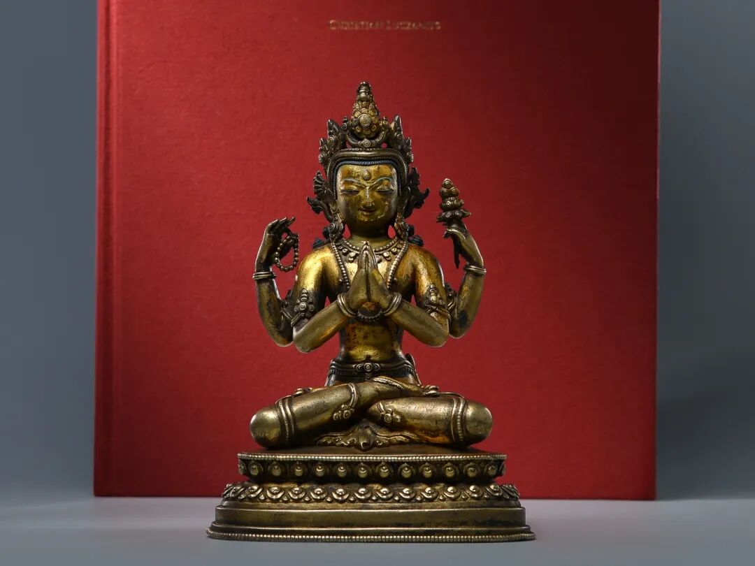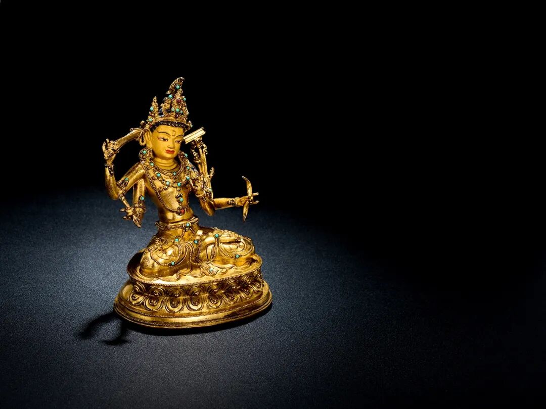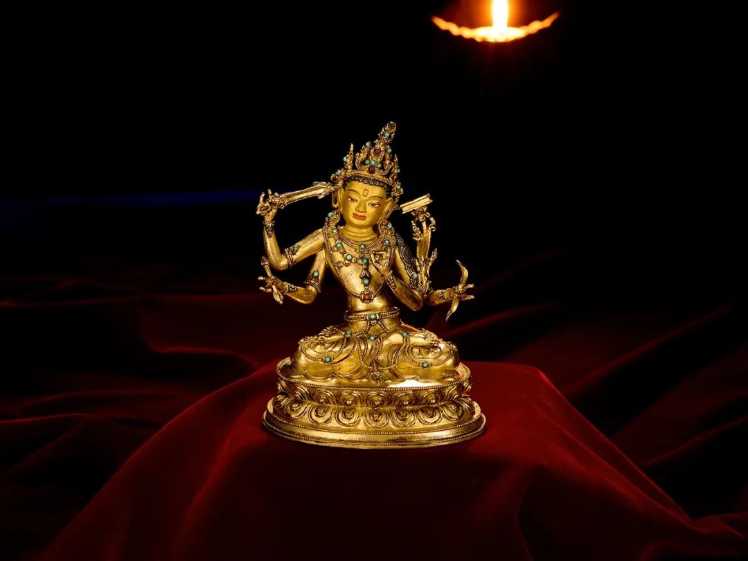 Lot 18 15世纪 极为罕见题材 金铜嵌宝石四臂文殊菩萨文殊菩萨经常高居显宗八大菩萨的首席尊神,是佛陀智慧的象征,是智慧的人格化形象,在印度以及西藏的很多佛教大师,都是以文殊作为自己主修本尊,比如著名的中观思想大师月称论师以及宗喀巴大师等。藏传佛教认为,修持文殊菩萨法门可以快速得到文殊的加持,而轻易得到世间以及出世间的智慧。文殊菩萨在藏传佛教中有多种不同的神格和形象,他们各个具有不同的宗教功用,其中四臂文殊的功用可谓最为殊胜。四臂文殊正确名称为“敏捷文殊”,以智慧敏捷见长;俗称“黄文殊”,以其身色为黄色而得名。按照藏传佛教的说法,修持文殊法门可以获得七种智慧,即广大慧、甚深慧、明辨慧、敏捷慧、写作慧、辩论慧及演讲慧。通观这尊造像,可谓造型完美,法相庄严,装饰繁缛,工艺精细,鎏金厚重,金层表面光洁度高,品相一流,充分展现了15世纪西藏佛教造像的工艺特点与艺术风采,不仅有着重要的文物艺术和收藏价值,而且具有极高的宗教价值,对于信仰者来说,是一尊十分难得的供奉上品。