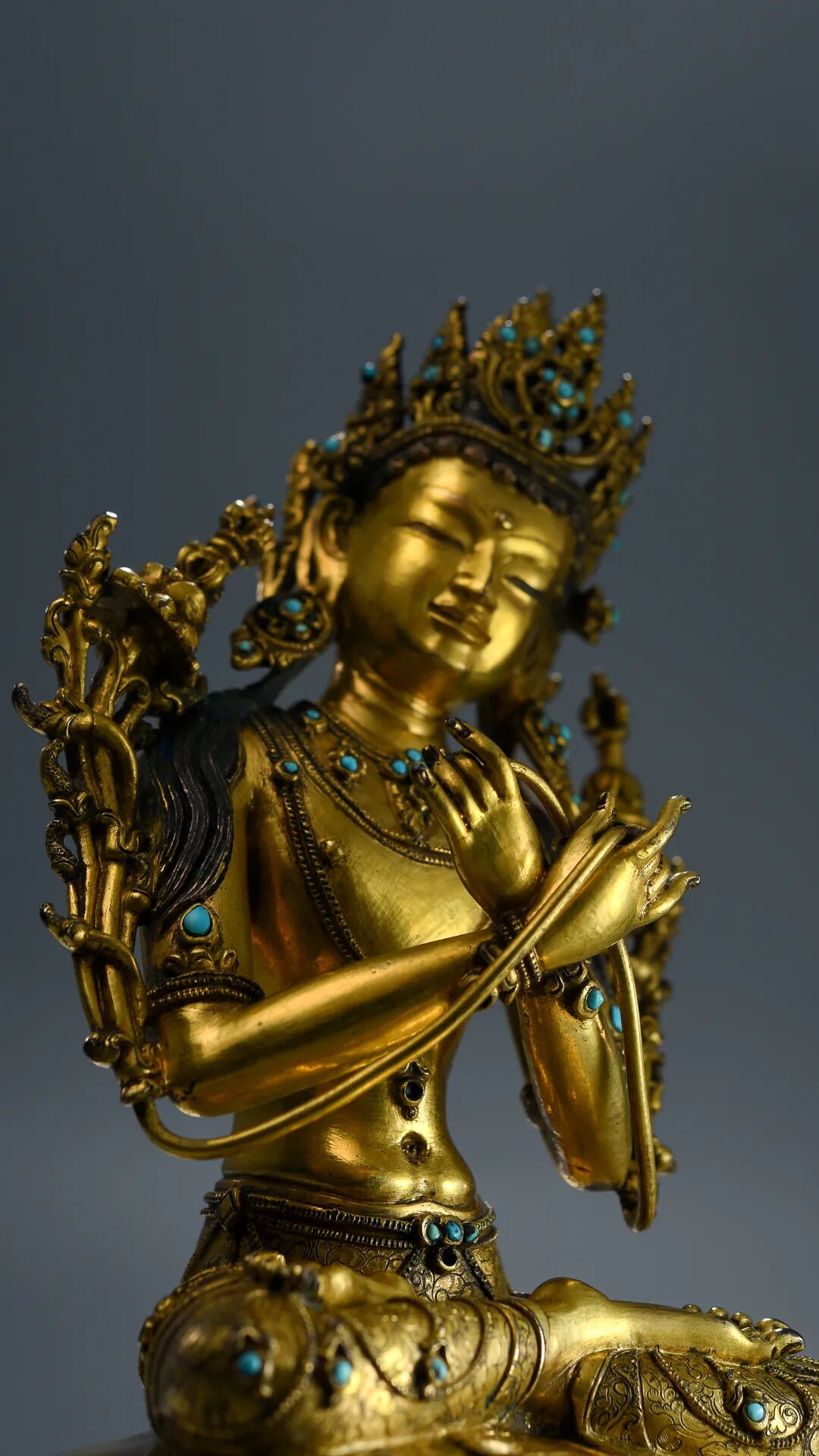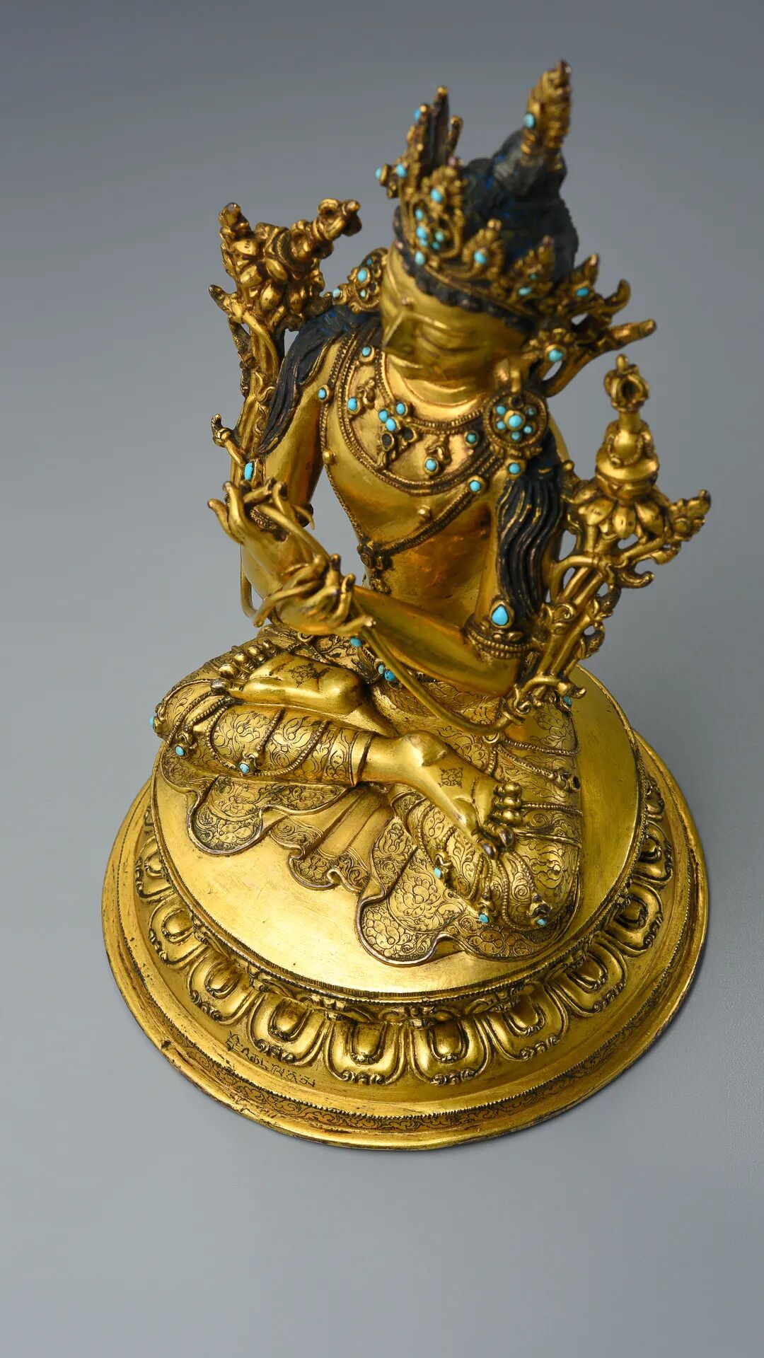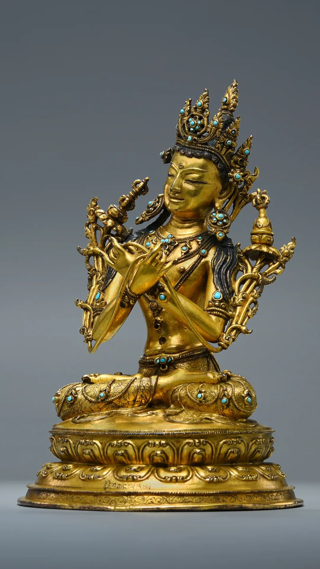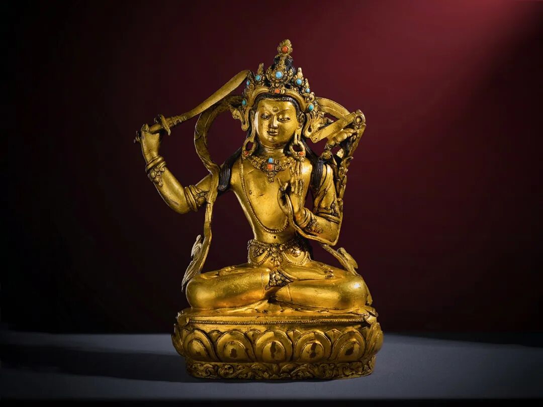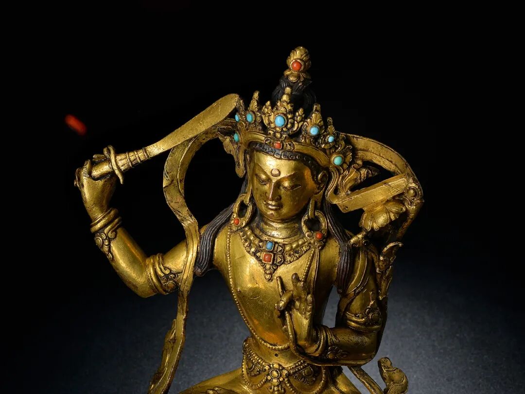 Lot 13 17世纪 扎什伦布寺风格铜鎏金嵌宝石文殊菩萨此尊文殊菩萨风格显著,通体鎏金满满,头戴镶嵌松石的五叶宝冠,髻顶安火焰宝珠,耳边装饰扇形冠结和U字形翻卷的缯带,头后有两绺余发垂于两侧;大耳垂肩,耳下坠花瓣形大耳饰。额部高广,额前露出涡旋状的发根,额心饰圆形白毫;双眉如剑,劲利地向两侧上挑,双目如秋水,目光俯视,饱含着无限温情;鼻梁直挺,上端连着剑眉,形成倒人字形,美丽而英俊;双唇抿成窝状,嘴角上翘,秀美中透着微微的笑意。身躯健硕,肌肉圆实,宽肩细腰,体态优美。上身袒露,胸前戴项圈和长链,下身着裙,腰间束宝带,手臂、手腕和脚腕戴钏镯。