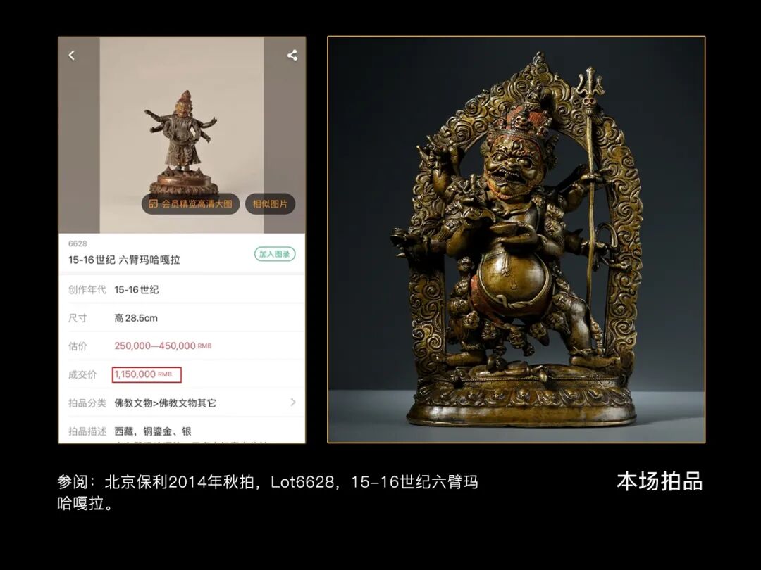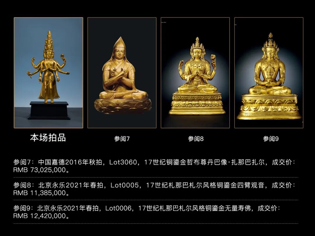 出版:Anna Maria Rossi & Fabio Rossi《Publication: Images of Faith, A Private Collection of Himalayan Art》著录:喜马拉雅艺术资源网,编号:68842。https://www.himalayanart.org/items/68842。本尊十一面观音像则是最纯正的扎那巴扎尔风格艺术的代表,整尊造像刀功极为细腻,轮廓显然经历了细致的打磨,这是衡量一尊造像精细度的重要指标。面部神情肃穆而威严,高挑的眉弓汇聚于鼻尾,鼻梁挺拔有力,下方的嘴唇饱满而厚实,嘴角有轻微向上的弧度,露出一丝不易察觉的微笑—以上面部特征均来自早期尼泊尔造像,可见扎那巴扎尔对古典主义美学的偏好。同样的偏好表达还可在菩萨的身型与裙裤上得到印证。菩萨宽肩、细腰,胸腹部肌肉有明显的隆起,腿部肌肉在贴体的裙裤下若隐若现,此特征同样源自古代尼泊尔,扎那巴扎尔继承了这一手法,但是有所增损,使肌体结构更加圆润柔和。参阅馆藏于乌兰巴托蒙古宗教历史博物馆和美国鲁宾美术馆的扎那巴扎尔风格弥勒菩萨,以及国外私人收藏的两尊扎那巴扎尔风格的十一面观音,与本件拍品对比,这五尊造像呈现出惊人一致的图像学特征和度量标准,尤其是造像身型比例、面部轮廓、五官刻画,以及袈裟边缘的几何形錾刻纹饰。尽管它们局部的刻画略有不同,但毋庸讳言,无论从浇铸和鎏金工艺,还是从风格造型和人物气质的刻画来看,它们都如出一辙,均是扎那巴扎尔艺术中的杰出代表。特别值得一提的是,现存的扎那巴扎尔风格的造像中,立姿菩萨像非常少见,而目前所知扎派造像的十一面观音仅三尊,除了前文示例的国外两尊私人收藏之外,目前可流通的只有本件拍品,此足见它何其珍贵稀有。而且本尊十一面观音为出自著名国际喜马拉雅艺术古董商罗西画廊(Anna Maria Rossi & Fabio Rossi),有着多次出版纪录,并于2016年在北京保利以690万释出,可谓传承有序、来源清晰、系出名门,历经过市场的考量,这样的背景在收藏领域已经显得愈发的重要。早在2009年北京翰海秋拍,一尊17世纪扎那巴扎尔风格弥勒就以1290万的成交价引发市场关注;2015年北京东正秋拍,一尊同样为罗西画廊旧藏的17世纪扎那巴扎尔风格的举剑文殊2000万的高价释出;2016年北京嘉德春拍,一尊·17世纪哲布尊丹巴像·扎那巴扎尔像更是以7300的天价创下扎派造像成交记录,更是点燃了整个喜马拉雅艺术收藏圈对于扎派造像的热情。此后几年扎那巴扎尔风格的造像的成交价在各类拍卖市场一直居高不下,在近两年全球经济发展放缓,以及艺术品成交遇冷的大环境下,扎那巴扎尔风格的造像不论是成交率还是成交价都是一枝独秀。2021年北京永乐春拍,一尊25.8厘米的17世纪扎那巴扎尔风格四臂观音和一尊32同风格的无量寿佛都已过千万的高价成交,可见艺术品市场对扎那巴扎尔风格作品的高度认可。