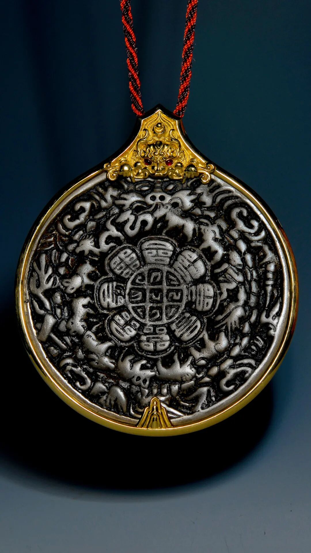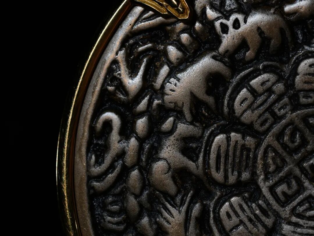 Lot 1 托甲九宫王!明代天铁九宫八卦镜 莲师咒牌此块九宫八卦牌质地细腻,漆黑如碳、包浆浑厚,宝光润美,这是九宫八卦牌里最顶级最少见也是最受推崇的天铁材质,而且尺寸够大、铸造够厚,手头够重,雕刻够高。在古代绝非普通人所能享用!!九宫,有这么一枚就够了,一辈子的护身咒牌,全国无论走到哪里都是响当当的魁首级别。因为年代久远牌子上原来的挂环已经磨损殆尽,所以为了方便佩戴特意包裹18K金,并镶嵌宝石作为点缀,让其在数百年后散发出新的光辉。整块九宫八卦牌繁复规整的布局、自然灵动的造型、繁复细腻的工艺,无不彰显出古代西藏雕塑的美学魅力。八卦牌上十二生肖写实生动的姿态、支巴扎狰狞怖畏的造型、以及娴熟洗练的雕刻手法,也反映出古代西藏雕塑艺术的杰出成就。其完美品相,承载着丰厚的文化内涵,展现着汉藏文化的交融,虽然只是一块小小的九宫八卦牌,却在历史、文化、艺术、工艺、宗教等有着种种卓尔不凡的表现力,有着巨大的宗教和文化价值。