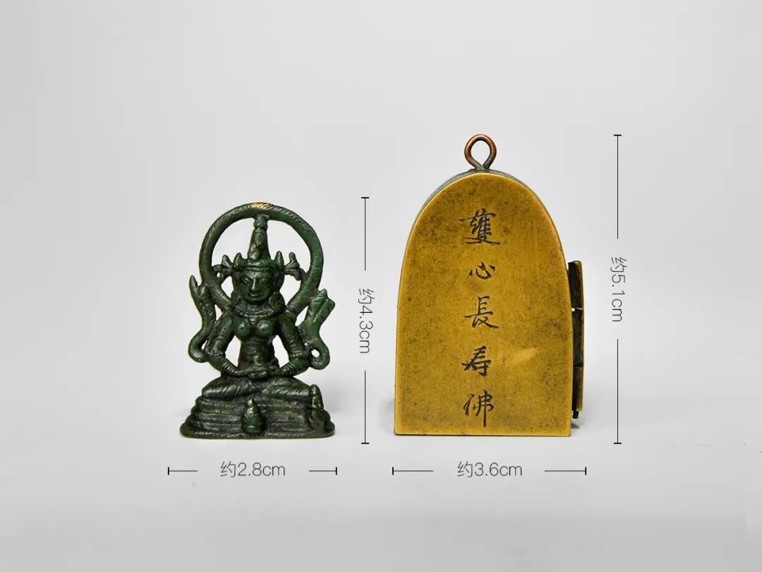 而此尊长寿佛被安放于一个黄铜噶乌盒当中,噶乌正面刻“護心長壽佛”,作者以刀代笔,字体遒劲有力,气韵连贯,气势非凡,噶乌内有锦缎内衬,可以很好的保护佛像。此噶乌应该是这尊帕拉长寿佛进贡给皇室后,为其量身打造的,为皇亲贵族的随身供养之物,等级极高,流传至今,不仅是一件难能可贵的收藏佳作,也是一尊可以传家的圣尊妙宝。