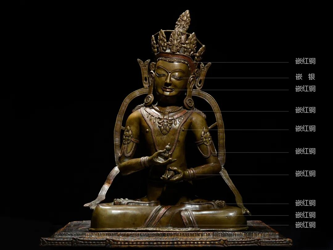 质地:合金铜(嵌银、嵌红铜)、底座木质此尊造像由两部分组成,佛身为十三世纪合金铜铸造;底座为十三世纪木质镂雕。造像整体高约61.8厘米,单是金刚萨埵本身就高达43.8厘米,近千年的岁月使得其金属皮壳呈现一种琥珀色的宝石般莹润光泽。此像脸型方正,双眉相连,眼睛细长,鼻梁直挺,嘴角微微上弯,目光低垂,配合略微吐内收含的下颌,慈悲之态飘逸传神。眼睛嵌银+红铜、嘴唇嵌红铜、帽冠嵌红铜、颈链嵌红铜、胸前璎珞嵌红铜、腰链嵌红铜、臂钏+璎珞嵌红铜、手镯嵌红铜、手指甲嵌红铜、脚指甲嵌红铜,而且所有镶嵌上都錾刻精美花纹,细观极其华丽。