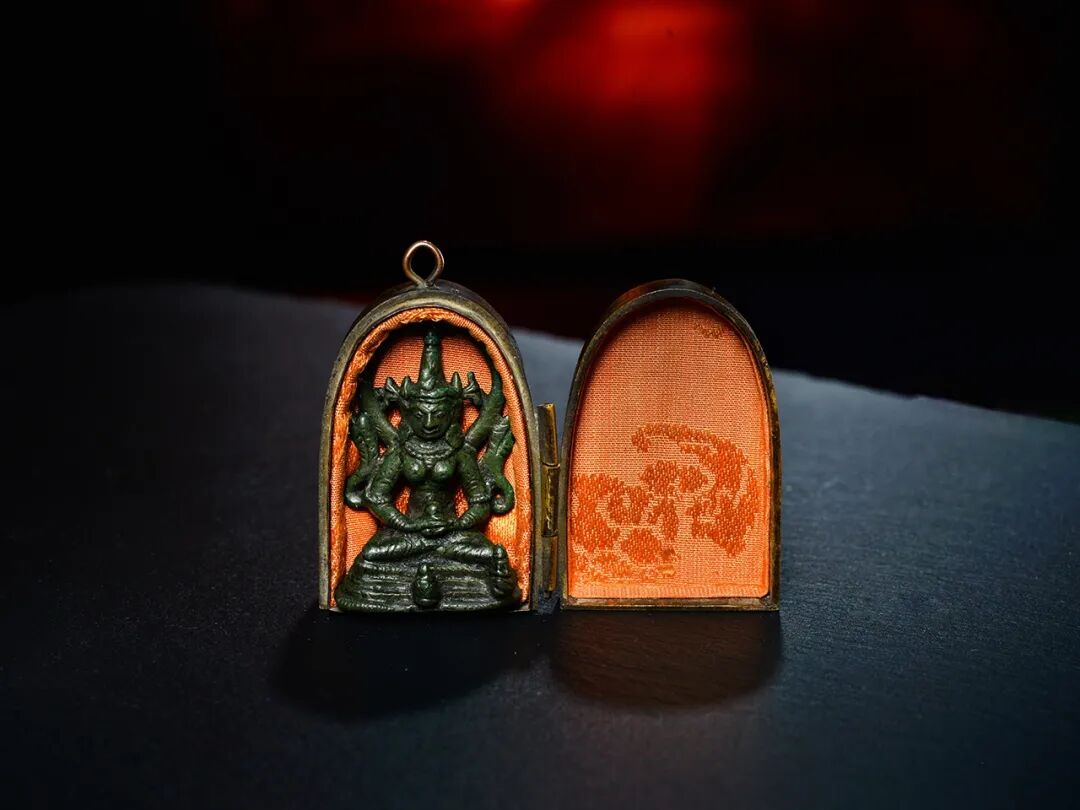 Lot 9 11世纪 所见最小帕拉王朝长寿佛!清代官造嘎乌尺寸:盒子高约5.1cm,宽约3.6cm;佛像高约4.3cm,宽约2.8cm帕拉王朝造像素来以做工精湛、肢体表现丰富、神态神秘而活泼,予人极高的价值感,对尼泊尔和西藏佛像有很大的影响,备受青睐,而且保存下来的数量很少,因此在国际上受到高度重视。