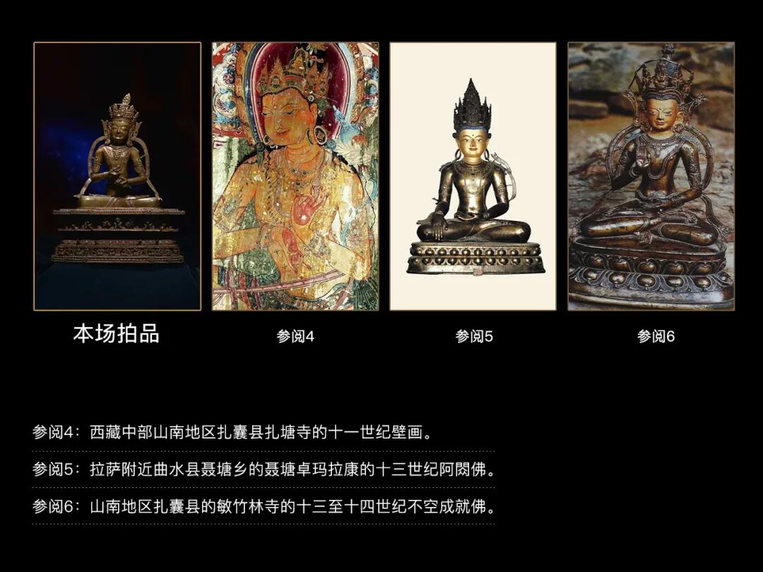 以龘藏秋拍的这尊金刚萨埵为例,其方正的开脸与已经损毁的艾旺寺和姜普寺两尊造像就非常相似,在位于西藏中部山南地区扎囊县扎塘寺的十一世纪壁画中也看到这类开脸的绘画作品,而现今保留西藏中部各大寺院里的此类风格造像就更多了,如位于拉萨附近曲水县聂塘乡的聂塘卓玛拉康的十三世纪阿閦佛,位于山南地区扎囊县的敏竹林寺的十三至十四世纪不空成就佛,位于拉萨大昭寺的十三世纪不动佛等等,都属于此类风格。